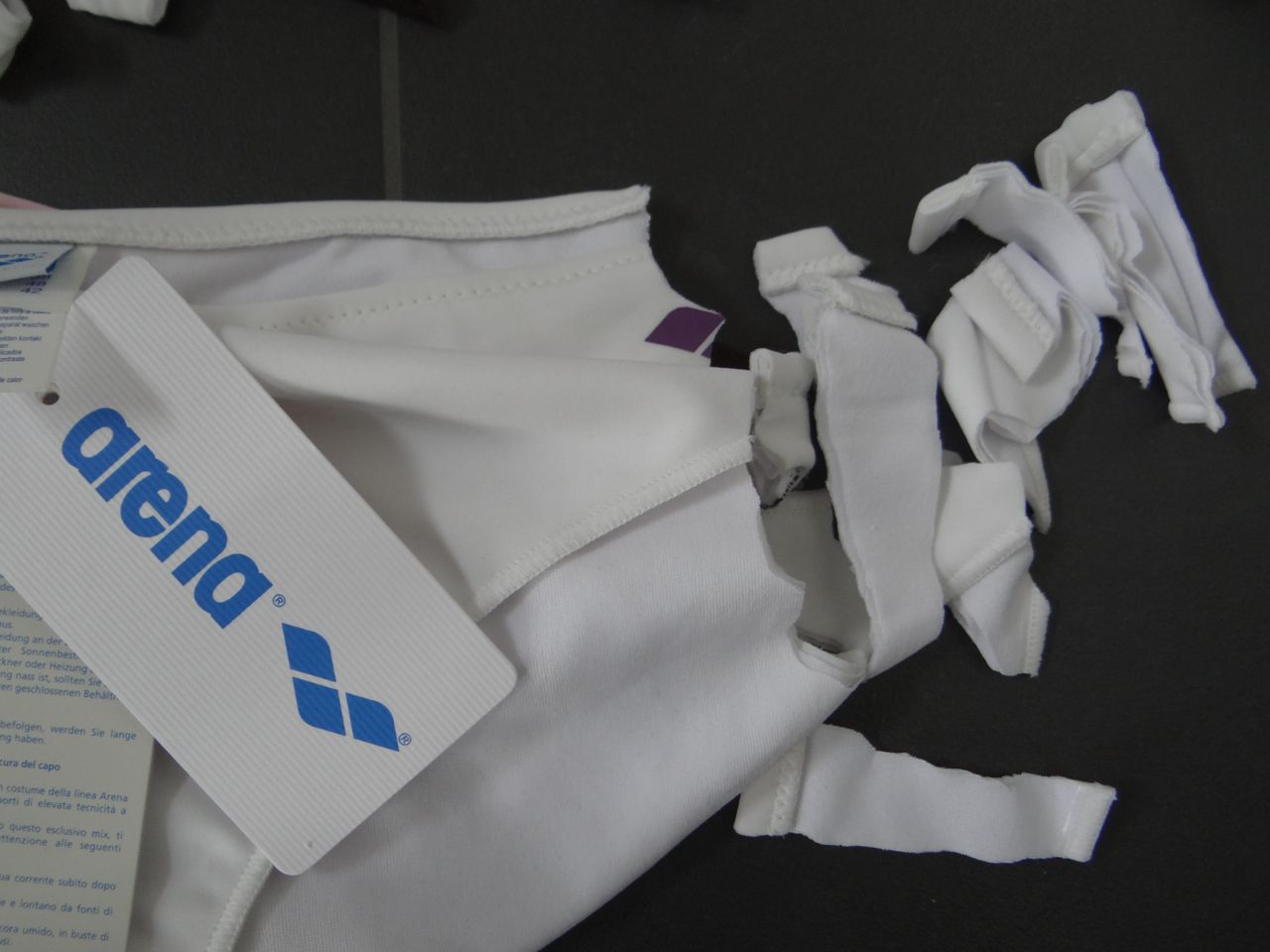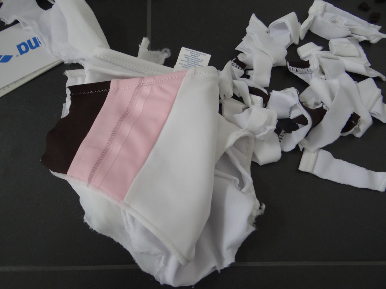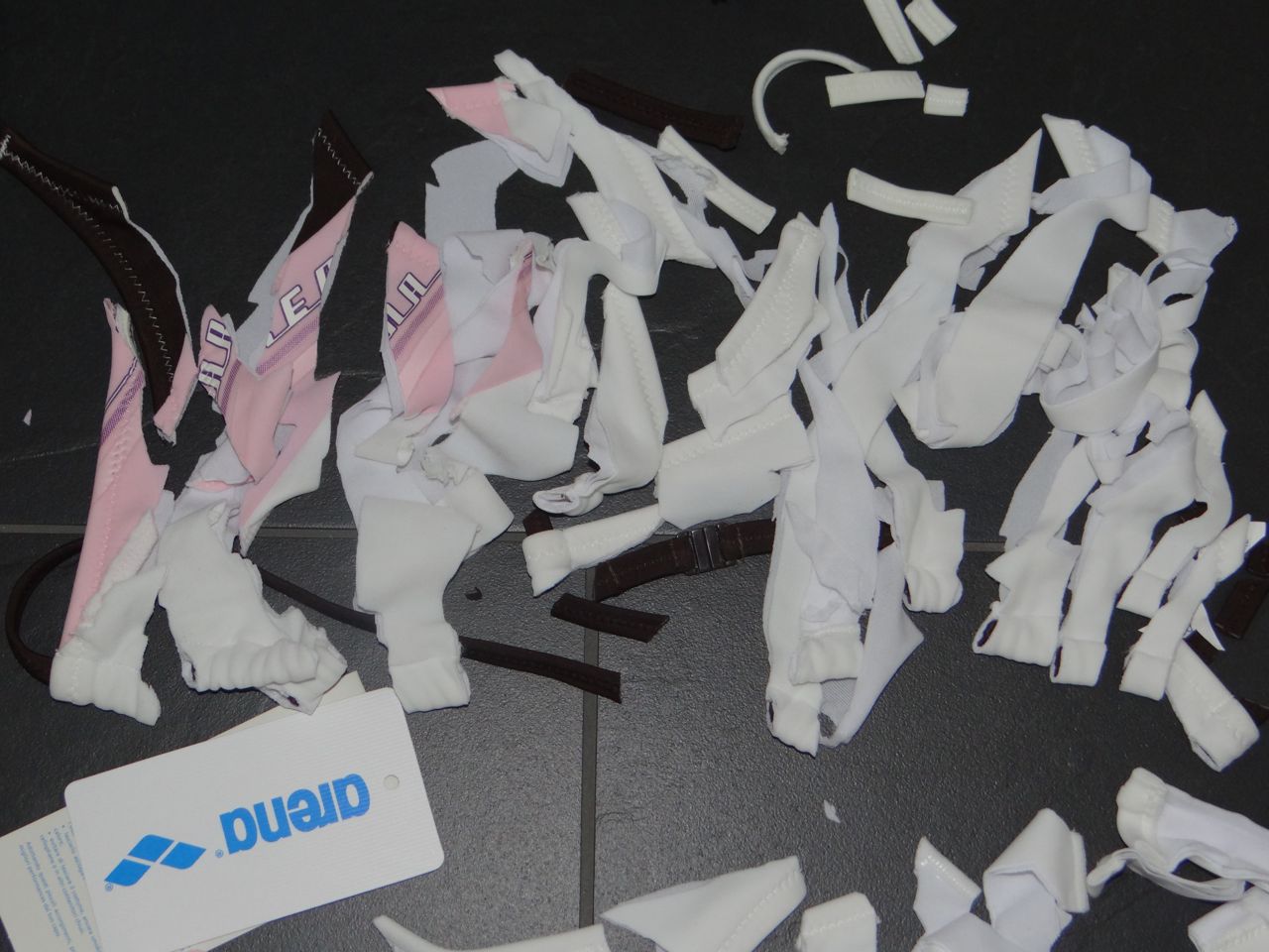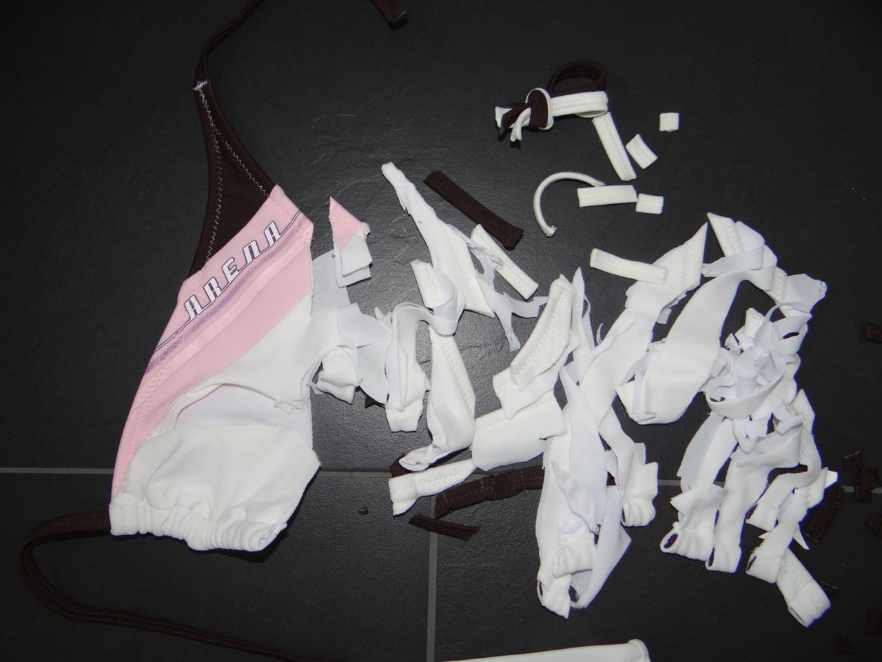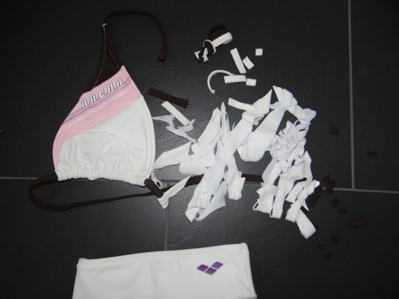 Heute musste mein neues Arena Bikini dran glauben... einfach so. Es gefällt mir nicht mehr. Es ist von letzter Saison, und kostete 70Euro... dafür lässt wichs schön zerfetzen. Material: 80% Polyamid, 20% Elasthan.