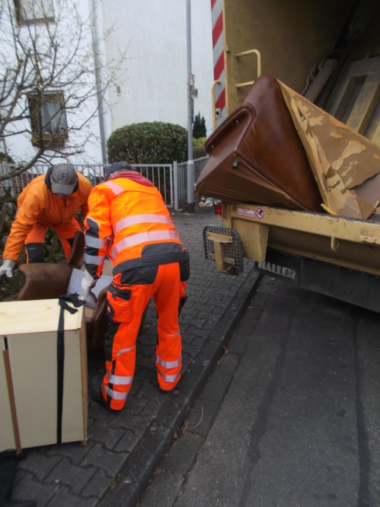 Zwei Orte weiter bei der Freundin angekommen, war ich erleichtert, dass dort noch kein Sperrmüll abgefahren worden war und kaum stand der für den Sperrmüll bestimmte Schuhschrank auf dem Bürgersteig, hörte ich es auch schon entfernt rumoren und krachen.