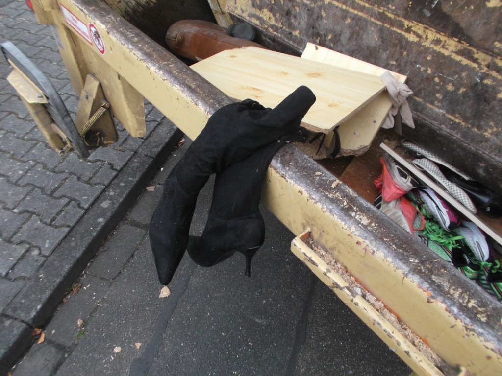Immerhin hatte Anja mit alten Strumpfhosen den Schrank gut zusammengebunden. Als ich den Schrank aus ihrer Garage zerrte, hing auch noch zu allem Überfluss ein Paar butterweiche Wildlederstiefel dran und ein weiteres Paar stand noch daneben und sollte offensichtlich auch "mit fort". (O-Ton Anja