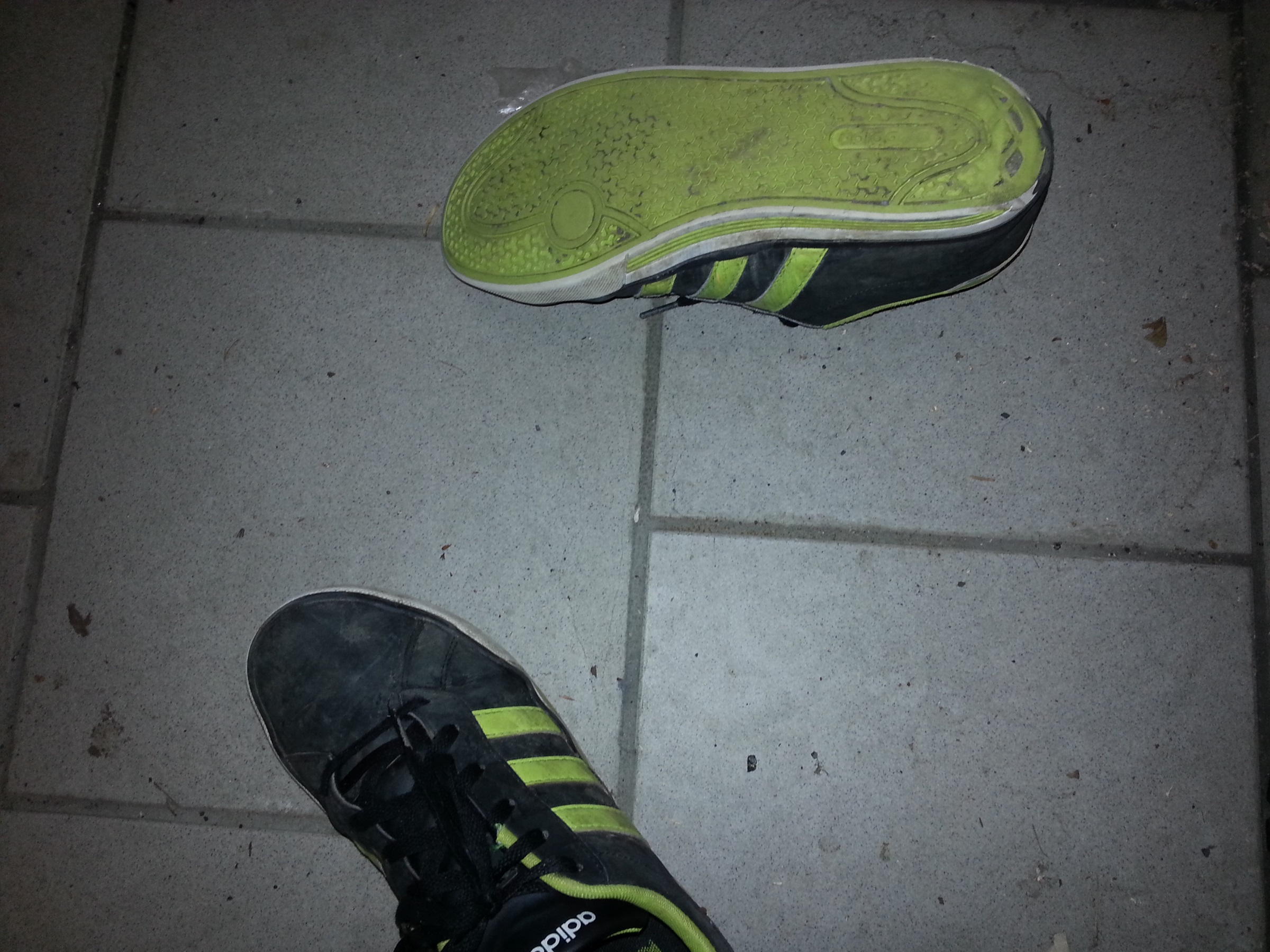 Als ich nach einem Wein für heute Abend Ausschau gehalten hab viel mir Vater und Sohn an der Wursttheke auf. Der Junior trug alte abgelatschte Adidas Neo Sneaker in dunkelblau mit Zitronengelben Streifen an den Füßen. Soweit ja nichts Besonderes da gerad sehr angesagtes Model bei den Kids. Was mich aber erregte war, das diese an der Ferse ca. um 45 Grad bis zum Schaft abgelaufen waren und sich die hochgezogene Sohle im Vorfus Bereich bereits vom Schaft abgelöst waren.