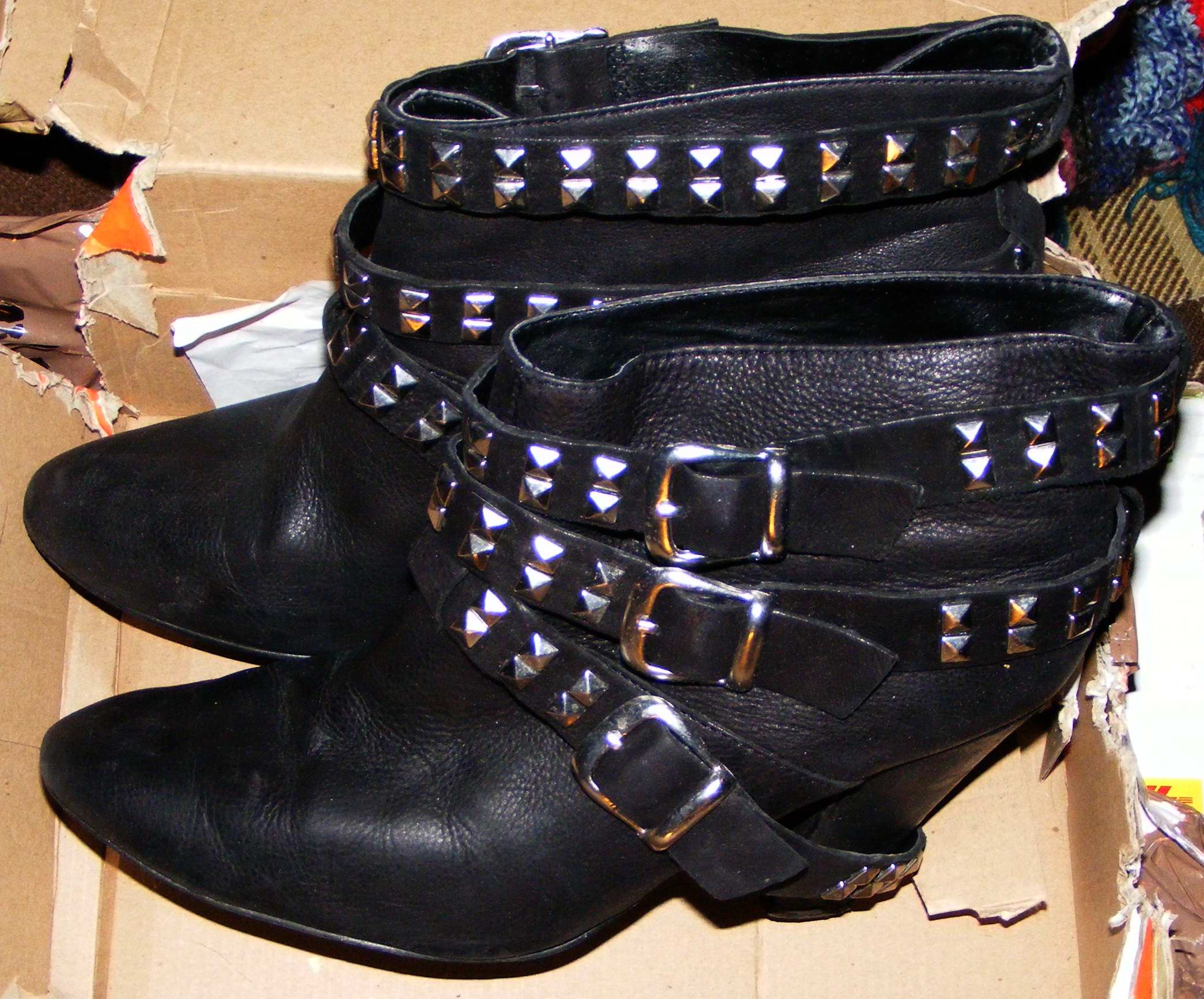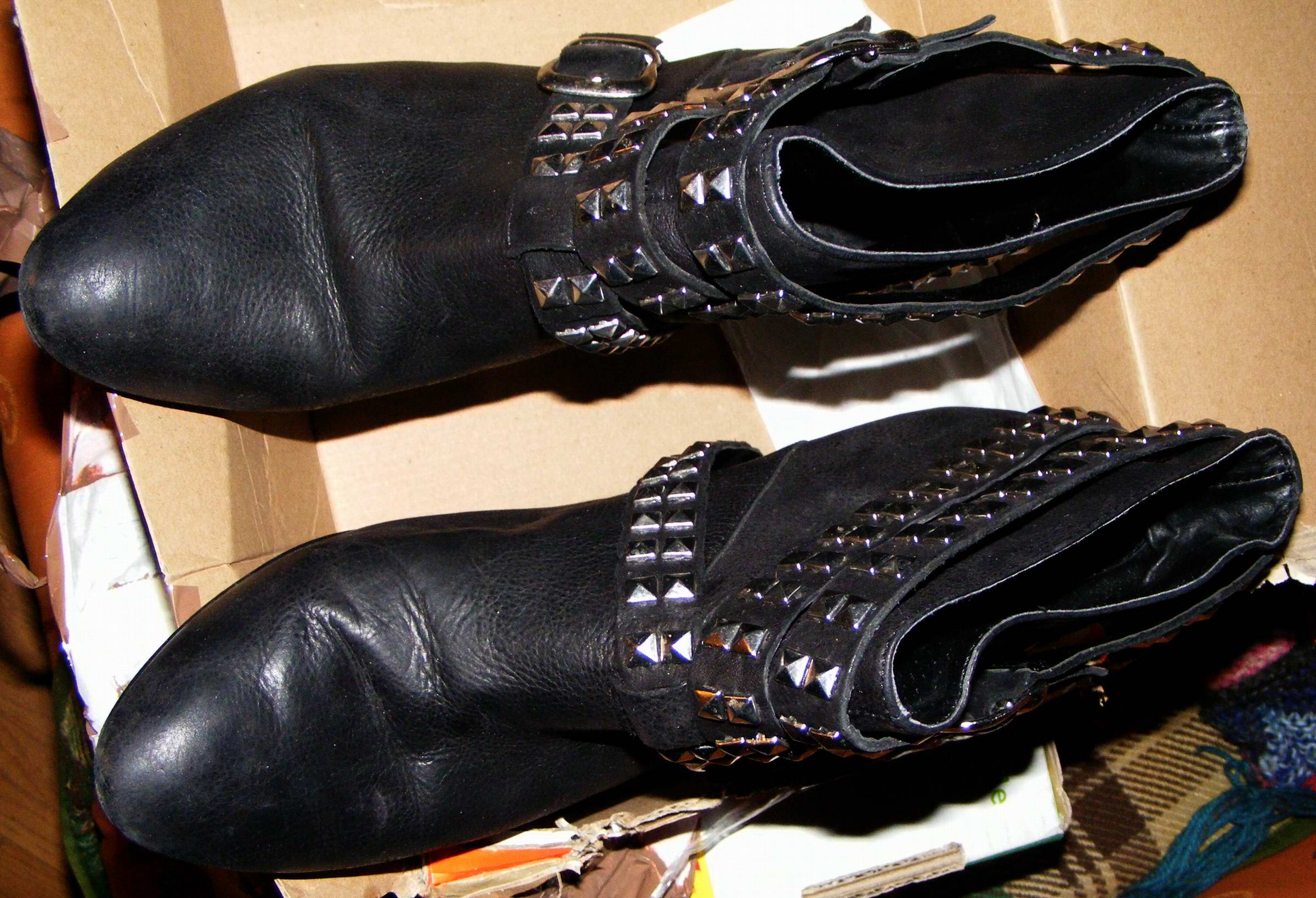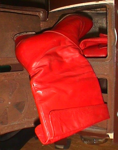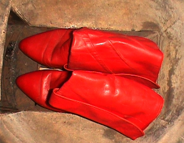 Während ich die nicht noch einmal getragenen schwarzen, nietenverzierten Stiefeletten nach einigen Jahren "Liegezeit" verbrannt hatte, trug ich diese Roten noch sehr oft und gern. Beim ersten Umzug hatte ich sie dann in einen Karton verpackt und seitdem nicht wieder ans Tageslicht gebracht.