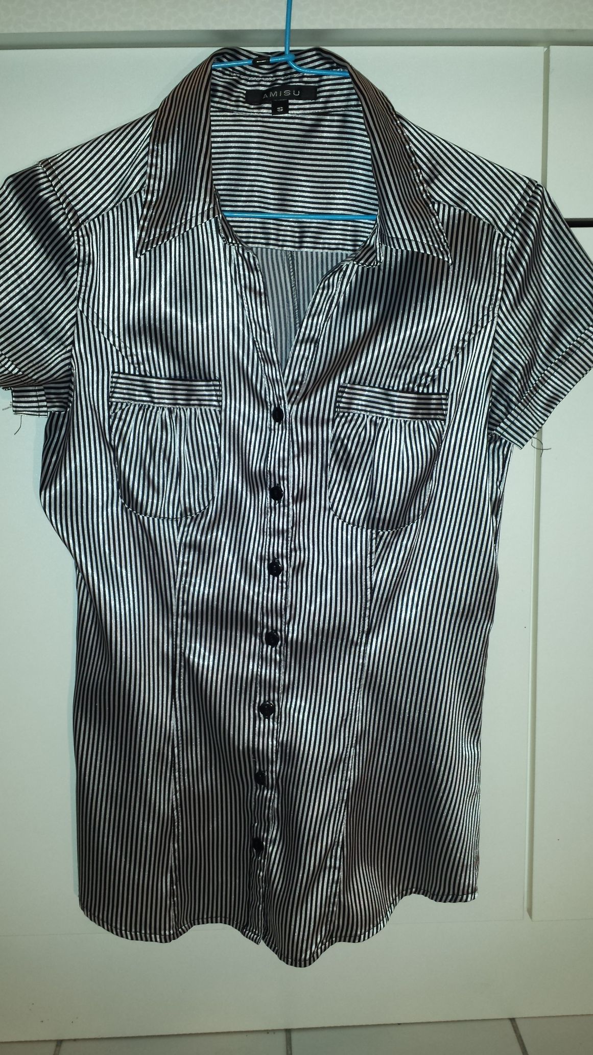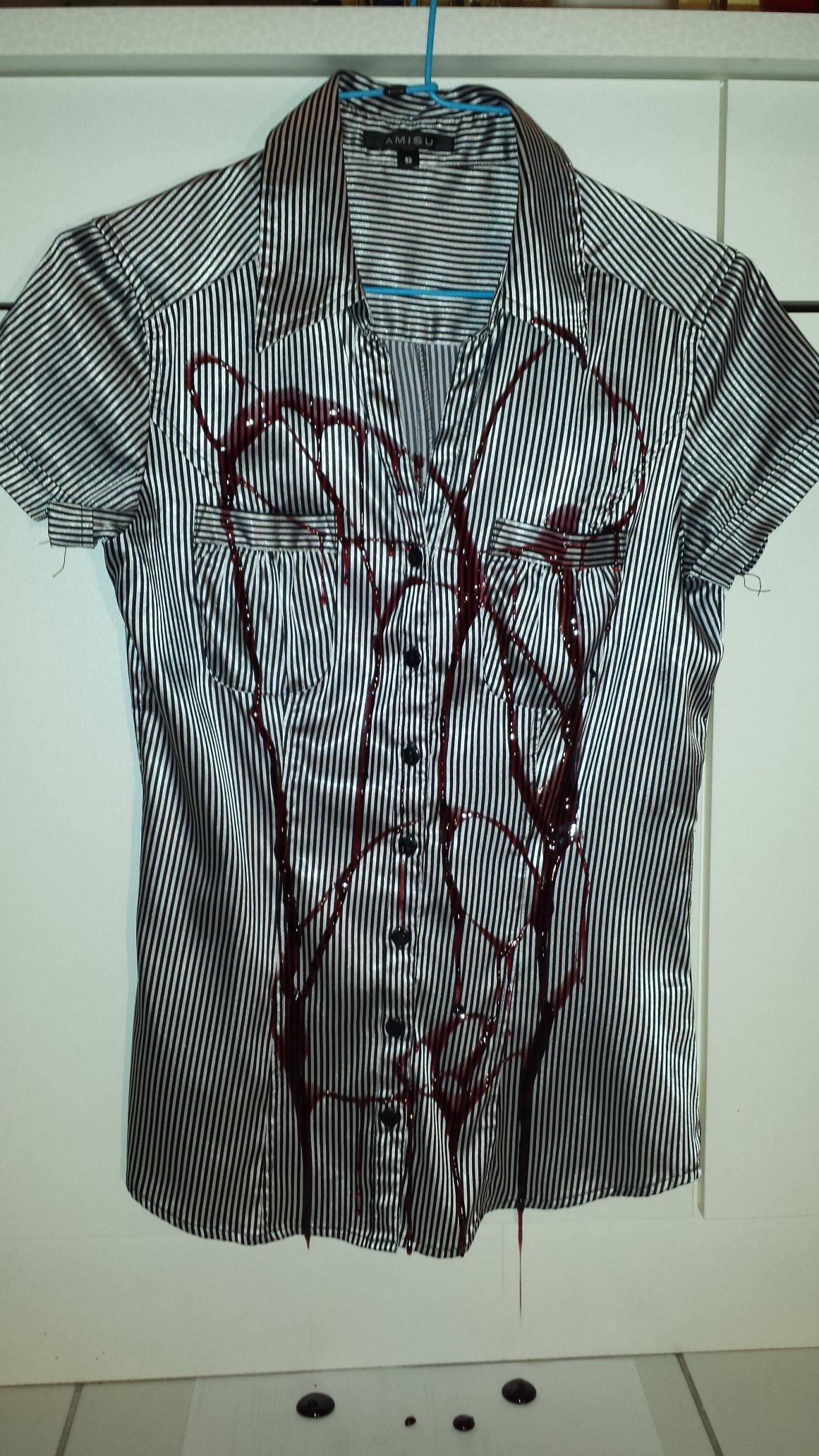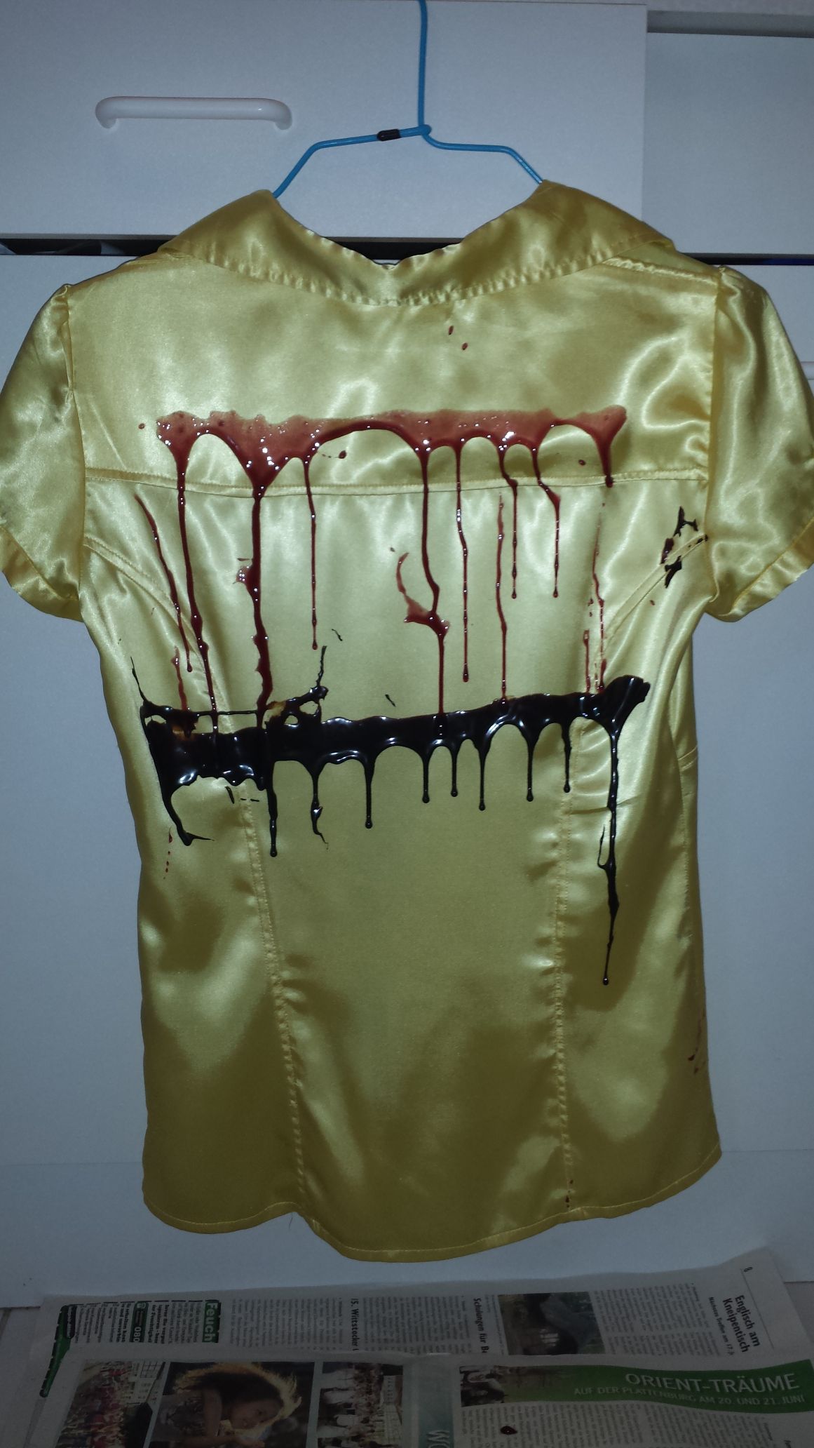 Weiter geht's. Schwarz/weiß gestreifte Satinbluse, die Arbeitskleidung meiner Frau. So sehr hat sie sich aber noch nie eingesaut, deshalb hab ich mal geholfen.