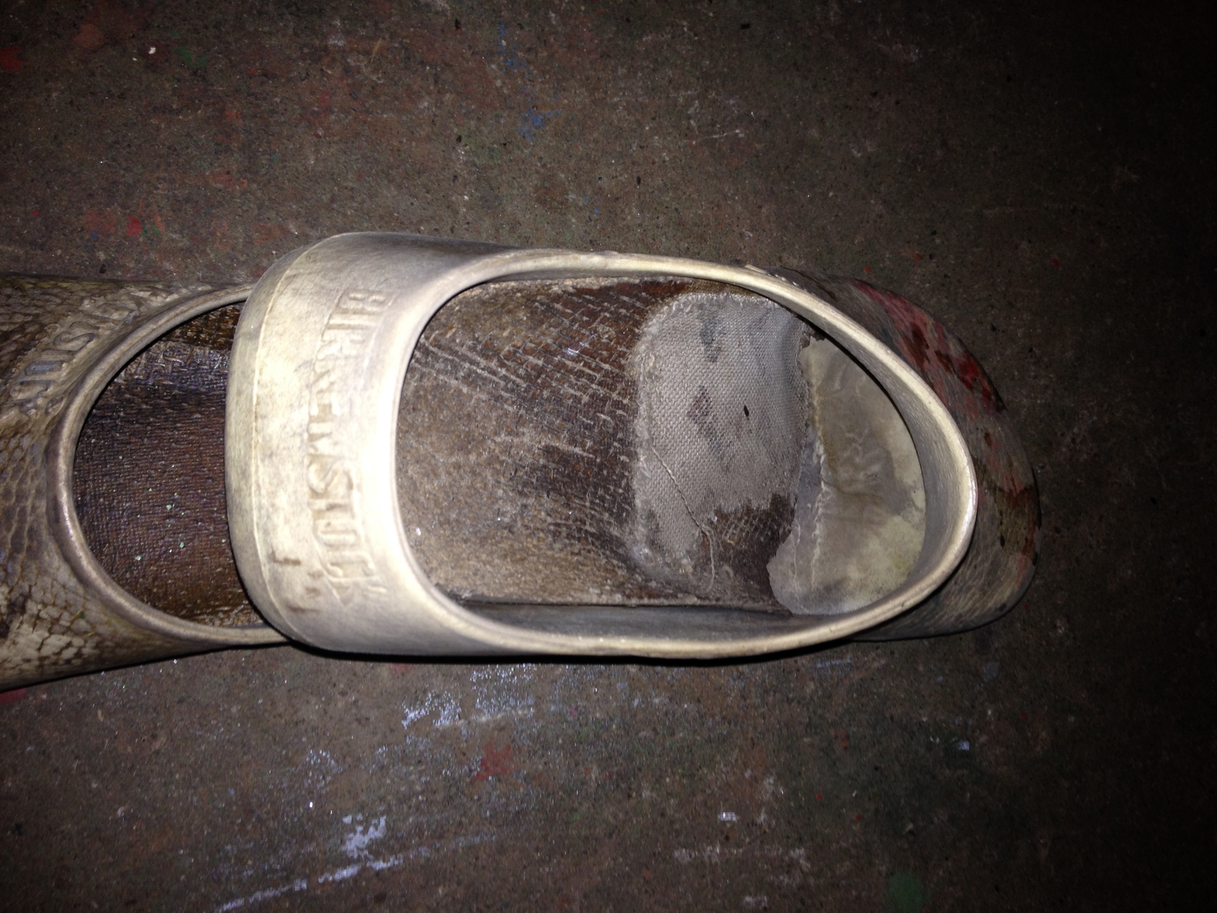 Wie man unschwer erkennen kann,sind ihr die eigendlich recht teuren Birkis für nichts zu schade,sie kricht Stundenlang über den Beton,beim Böden malen,EGAL!!! ob die spitzen abscheuern oder ob beim holzimprignieren Farbe drau troft oder sonnstiger Dreck anhaftet,nach getaner Arbeit bleiben die Latschen immer im Carport vor ihrer jetzigen Wohnung unbeachtet stehen bis zum nächsten einsatz oder zum Gassi gehen mit den Hunden.