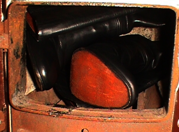 Ich habe die Stiefel im Winter 1998 mit zahlreichen Nässeflecken entfärbt und verstaubt in einer großen Brennholzkiste zwischen Holzscheiten vor einem "entmieteten" Haus gefunden. Ich wollte damals wenigstens die "Entsorgung" ordnungsgemäß zu Ende führen! Auf Grund ihres schlechten Zustandes lagen sie bei mir noch lange im Brennmaterialbestand. Sie waren zusätzlich mit einer Gummisohle versehen worden, die ich natürlich wieder entfernt habe. Die Aufarbeitung war eine wirkliche Herausforderung! (Schwitz)
