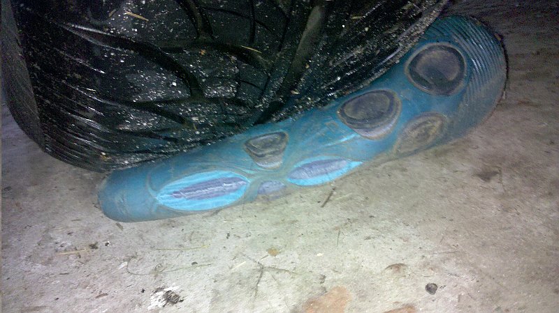 PVC Gummistiefel unter Autoreifen (Anfangsstadium)