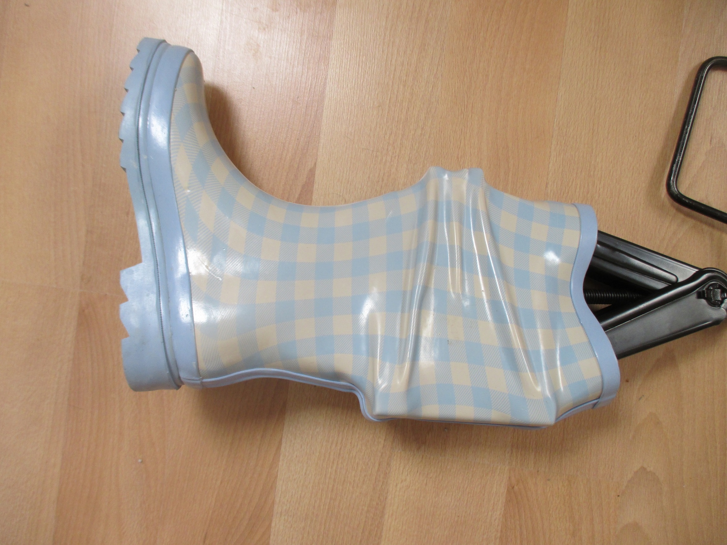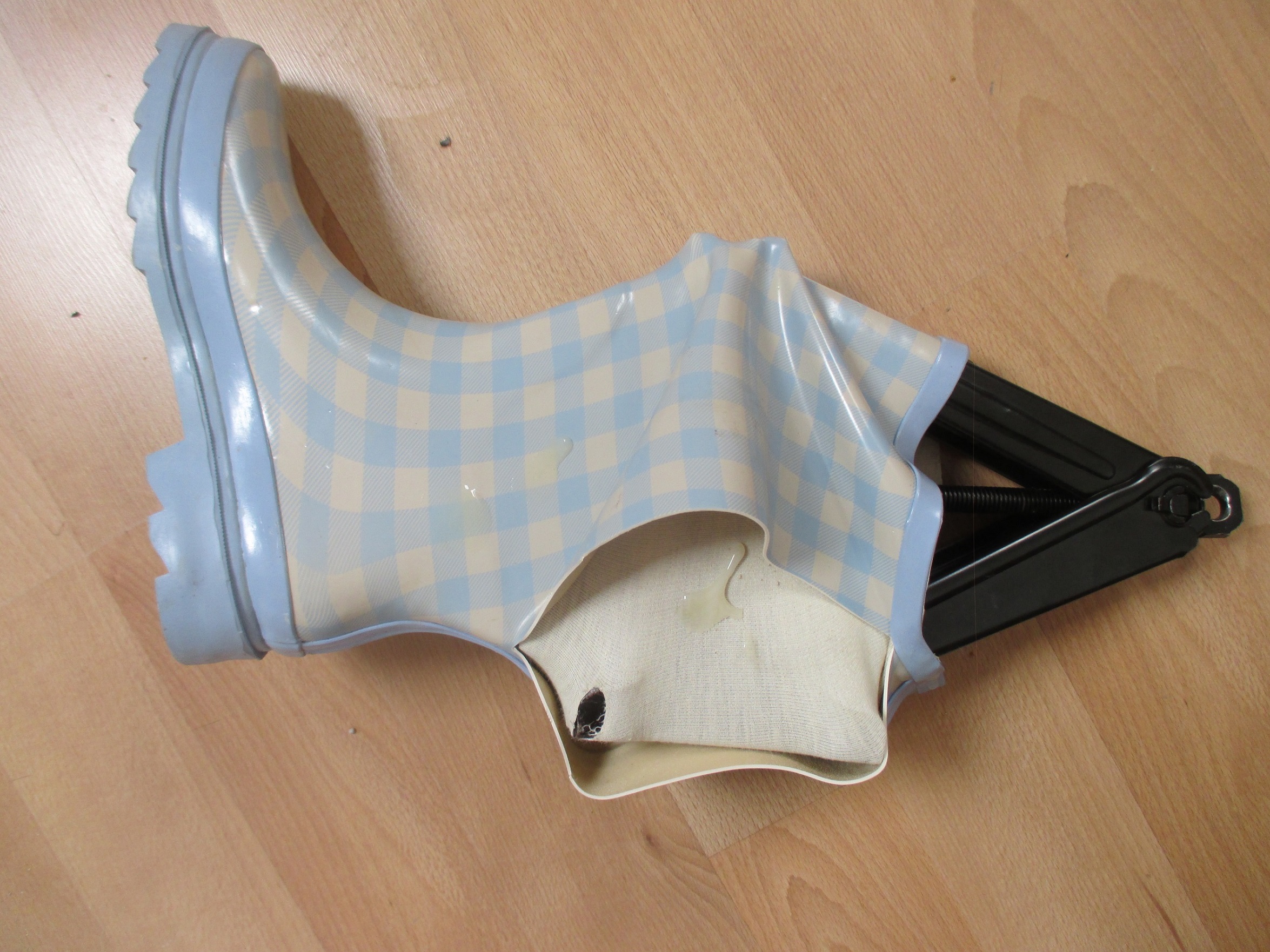 Habe mir vor einiger Zeit rote Romika Gummistiefel vorgenommen, siehe hier. Macht Spaß zu sehen, wie der harte Gummistiefel doch den Kräften des Wagenhebers nachgeben muß. Keine Ahnung, warum die so eine harte Pvc Mischung verwenden, wenn ich da an die wunderbar weichen Phönix Gummistiefel denke ...