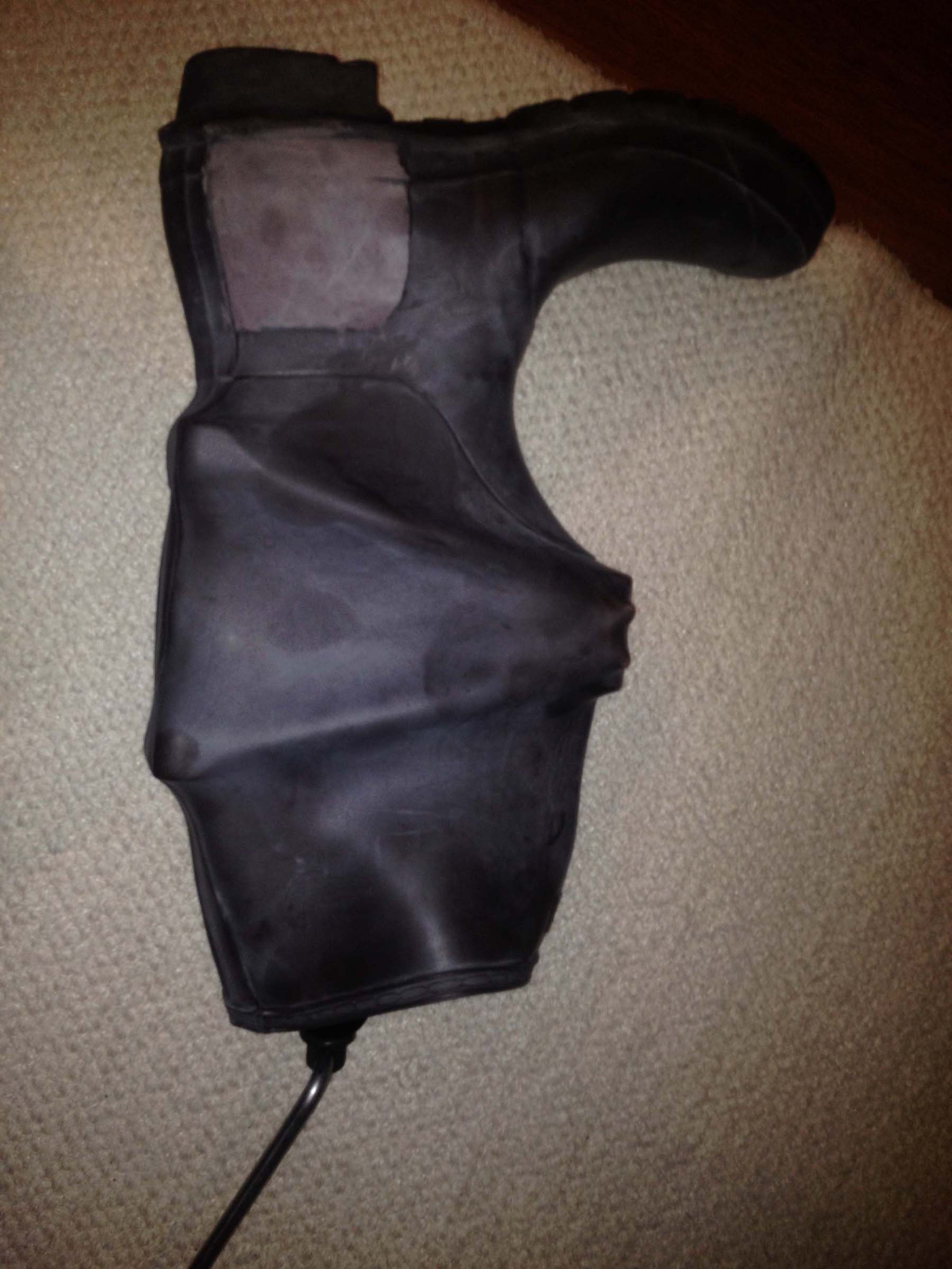 wie schauen deine Stiefel jetzt aus? Kam es zum ultimativen Riss oder hast du vorher aufgehört sie zu dehnen? Auf jeden Fall müssten ein paar Beulen haben.