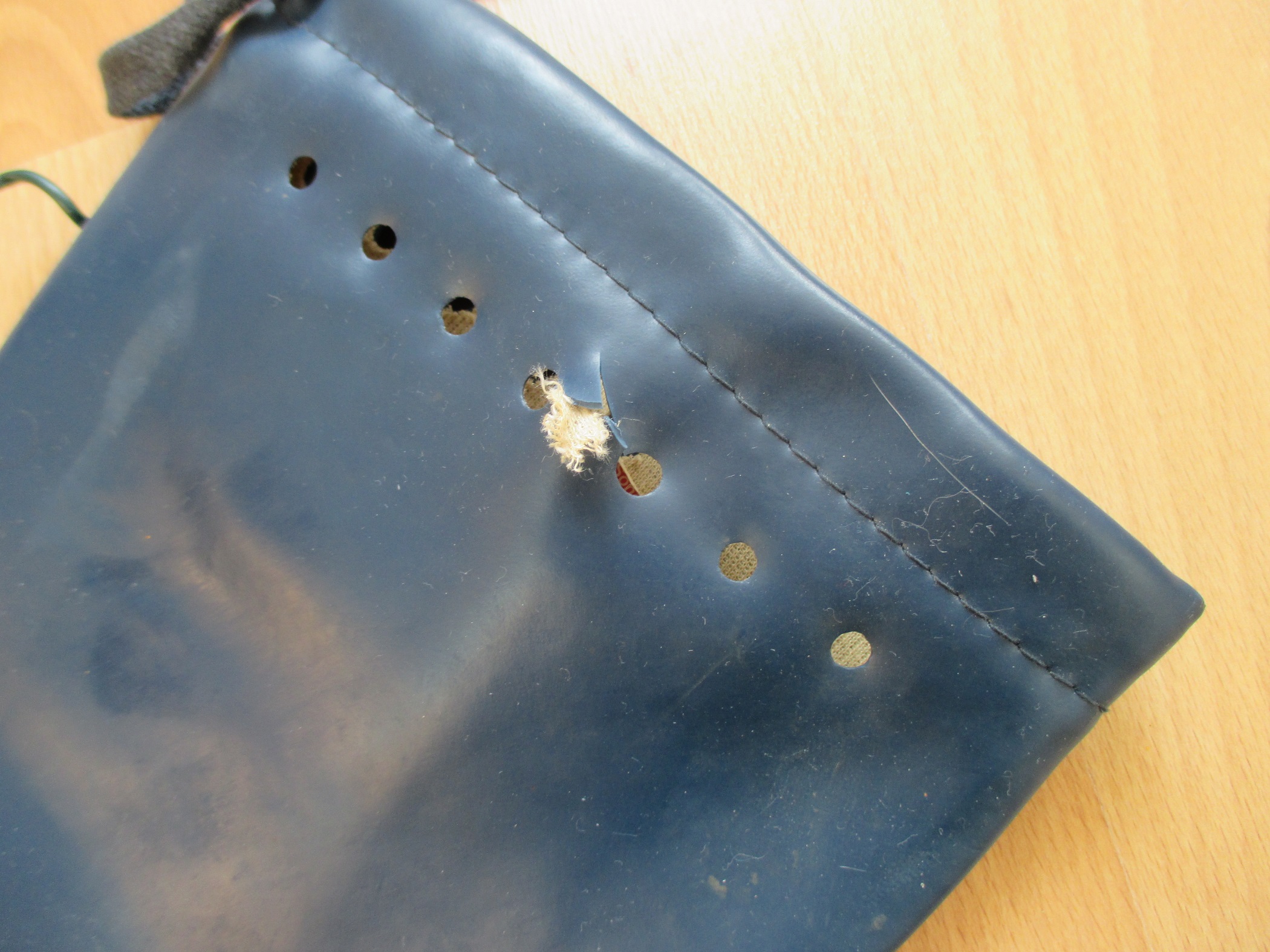 hier seht ihr, wie sich eine Schraube in den linken Gummistiefel gebohrt hat. Er war sowieso schon undicht wie man sieht. Ansonsten ist er aber noch ganz gut erhalten. Auf jeden Fall kann die Vernichtungorgie weitergehen.