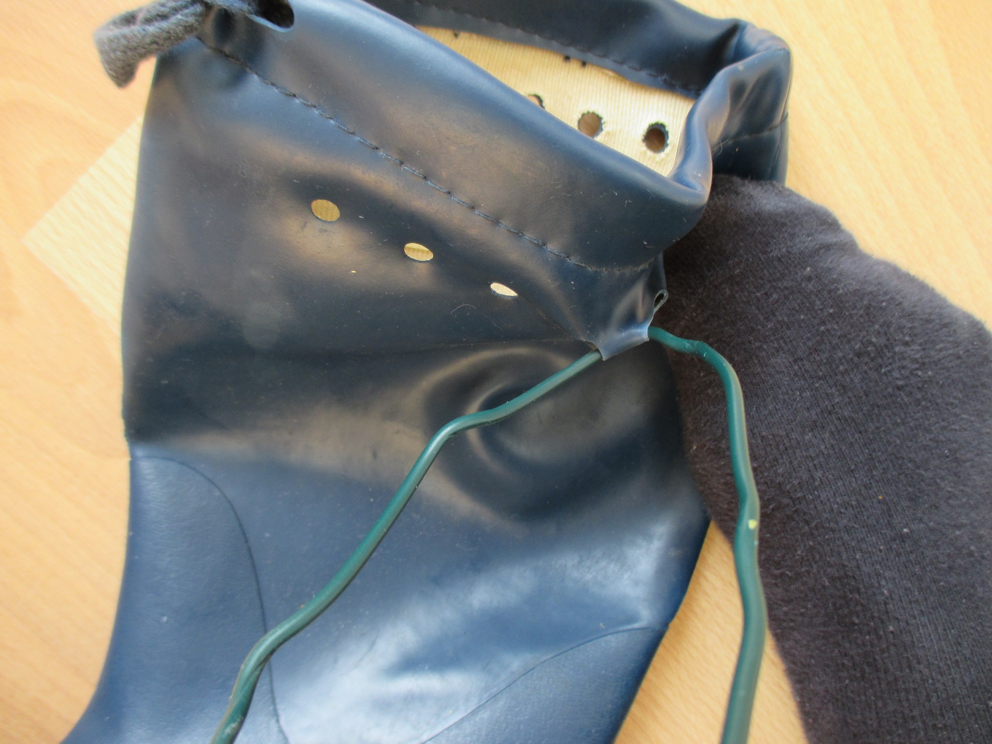 Dann steckte ich den Draht quer durch den Gummistiefel und zog daran. Ich konnte ganz schön kräftig daran ziehen. Dann zog ich mal ruckartig und es machte ratsch. Echt geil!!!