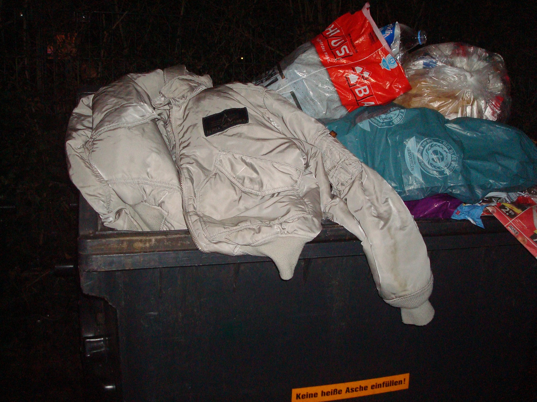 Die Kerle vom Abfallmanagement haben die ersten Container für die Abfuhr vorbereitet. Der Container wo die Bomberjacke zuerst drin lag ist Randvoll. Die Bomberjacke haben die Typen in den nächsten vollen Müllcontainer transportiert und den Deckel mit Gewalt geschlossen. Die Bomber ist in eine beklemmenden Lage. Na, mal sehen ob der Bomber helfe.