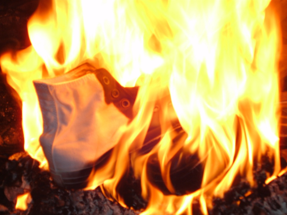 Jetzt ist der Moment gekommen, an dem die "Beobachtung" beendet wird. Die Ofentür wird geschlossen, schließlich soll die Wärme nutzbringend wirken und immerhin dient diese Aktion ja in erster Linie dazu, die ausgemusterte "Saisonware" zu Entsorgen. Vermutlich wird die "Durchschnittsfrau" keine weiteren großartigen Gedanken an den sterbenden Stiefel verschwenden und sich in den folgenden Minuten mit anderen Dingen des Haushalts beschäftigen, vielleicht muß der zweite Stiefel auch noch längere Zeit allein vor dem Ofen ausharren, in dem es nun langsam wieder etwas "ruhiger" wird. Die Hausfrau kommt zurück, stellt äußerst zufrieden die bewußt erwünschte, vollständige Beseitigung des ersten Stiefels fest, wirft einige Holzscheite und eine Handvoll kaputte Strumpfhosen nach, läßt diese bei geschlossener Feuertür heftig Aufbrennen. Nun ist der zweite Stiefel an der Reihe, das "Verfahren" wird etwas abgekürzt, der Schaft wird nur seitlich Umgeschlagen, das Päckchen kommt um 90° gedreht auf den noch erkennbaren Holzscheiten zu Liegen. Die Feuertür wird sofort geschlossen, der Feuersturm erreicht sehr schnell seinen Höhepunkt. Zufrieden befühlt die Frau den warmen Kessel des Ofens, kein bedauernder Gedanke mehr an die "alten" Stiefel, das Alles war ja so gewollt! :P
