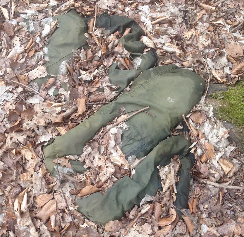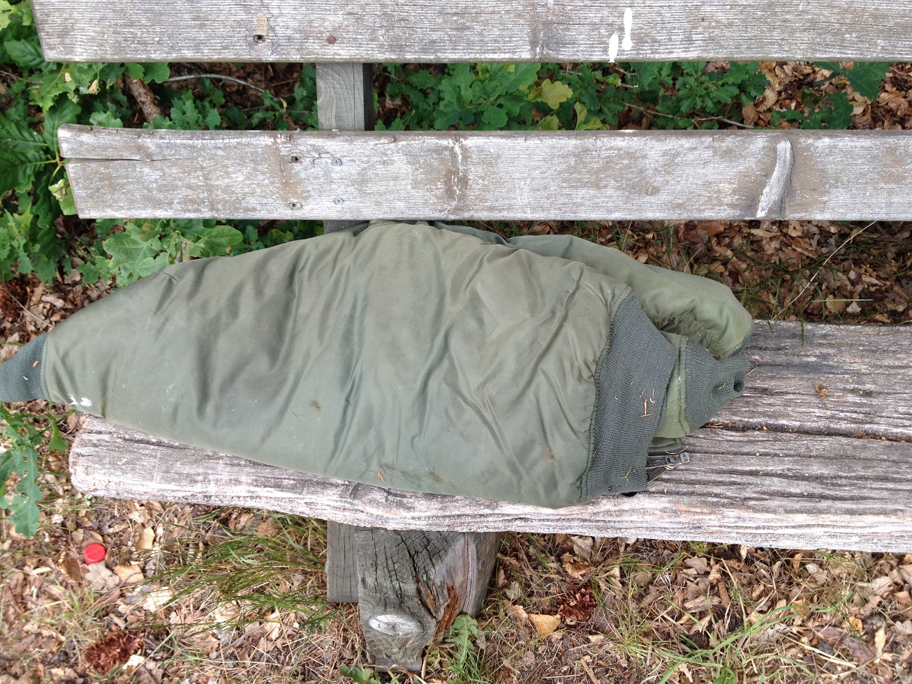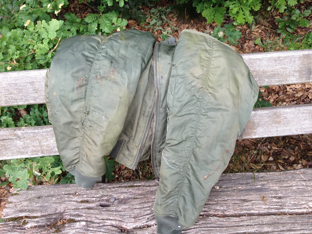 Habe den Bomber Putzlappen letzte woche mal besucht. Die jacke verfault im wald. Sie ist dort seit letztes jahr. Sie ist total mit blättrrn bedeckt vom herbst. Auf der orangen seite die liegt unten ist sie weiss verschimmelt. Daneben verwest eine dunkelrote bomberjacke. Werde sie mir bald wieder holen.