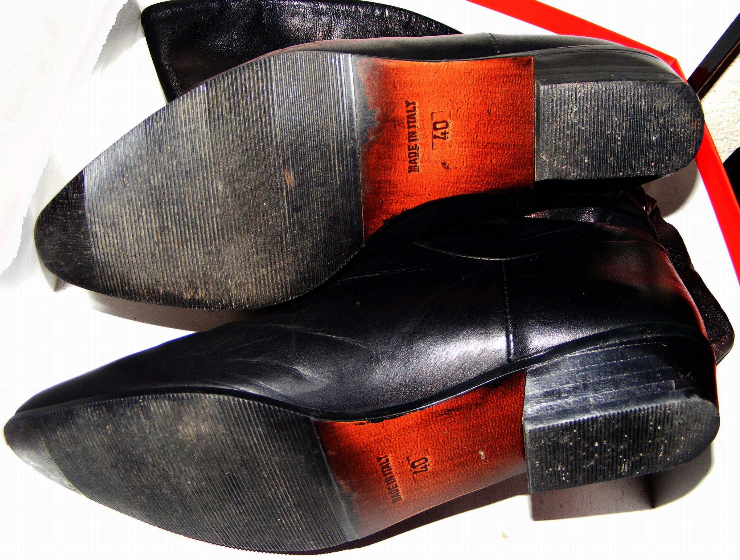 Bei den Schuhen handelt es sich um klassische schwarze Glattlederstiefel, die ab nächsten Herbst bei Regen, Schnee und Matsch ordentlich getragen werden sollen und natürlich müssen die Absätze bombenfest halten.