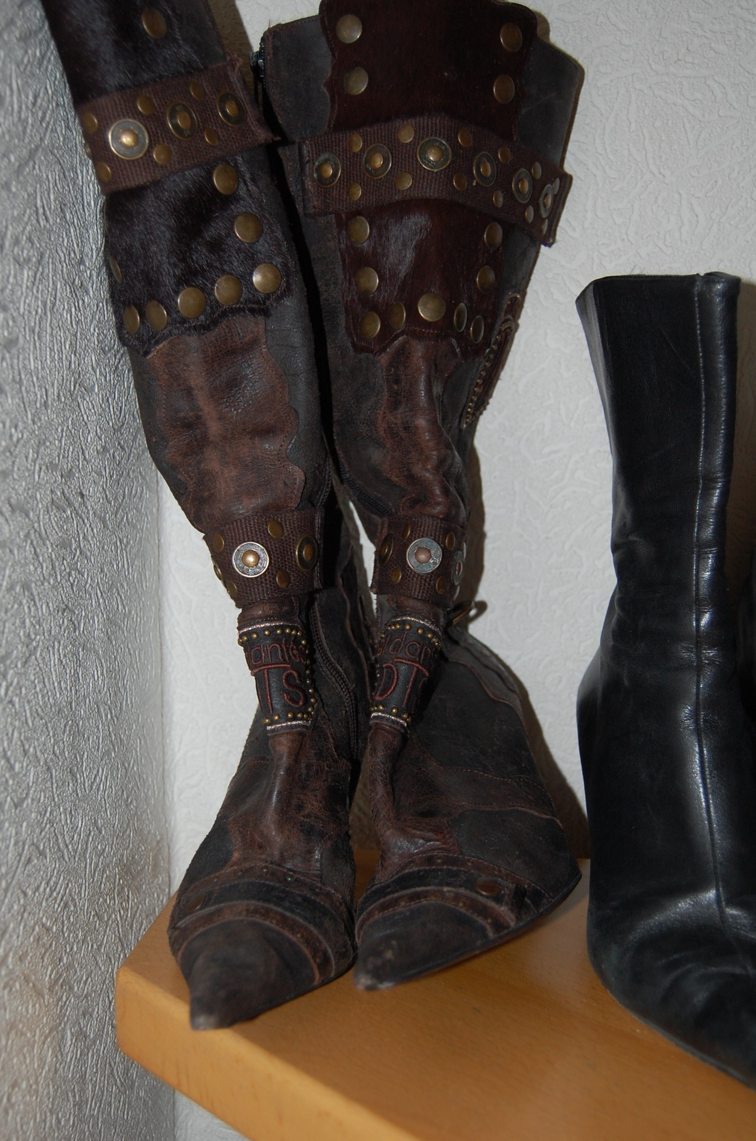 Beginnen möchte ich mit den braunen Stiefeln. Es handelt sich um superspitze Stiefel der Marke „El Dantes“ aus Spanien. Der Neupreis lag damals schätzungsweise bei ca. 200,00 € plus X, also kein billiges Vergnügen. Die Stiefel wurden in Volllederausführung hergestellt. Bezeichnend ist der Mix aus verschiedenen Ledersorten aufgepeppt durch zahlreiche detailverliebte Nietenapplikationen und aufwendige Stickereien.