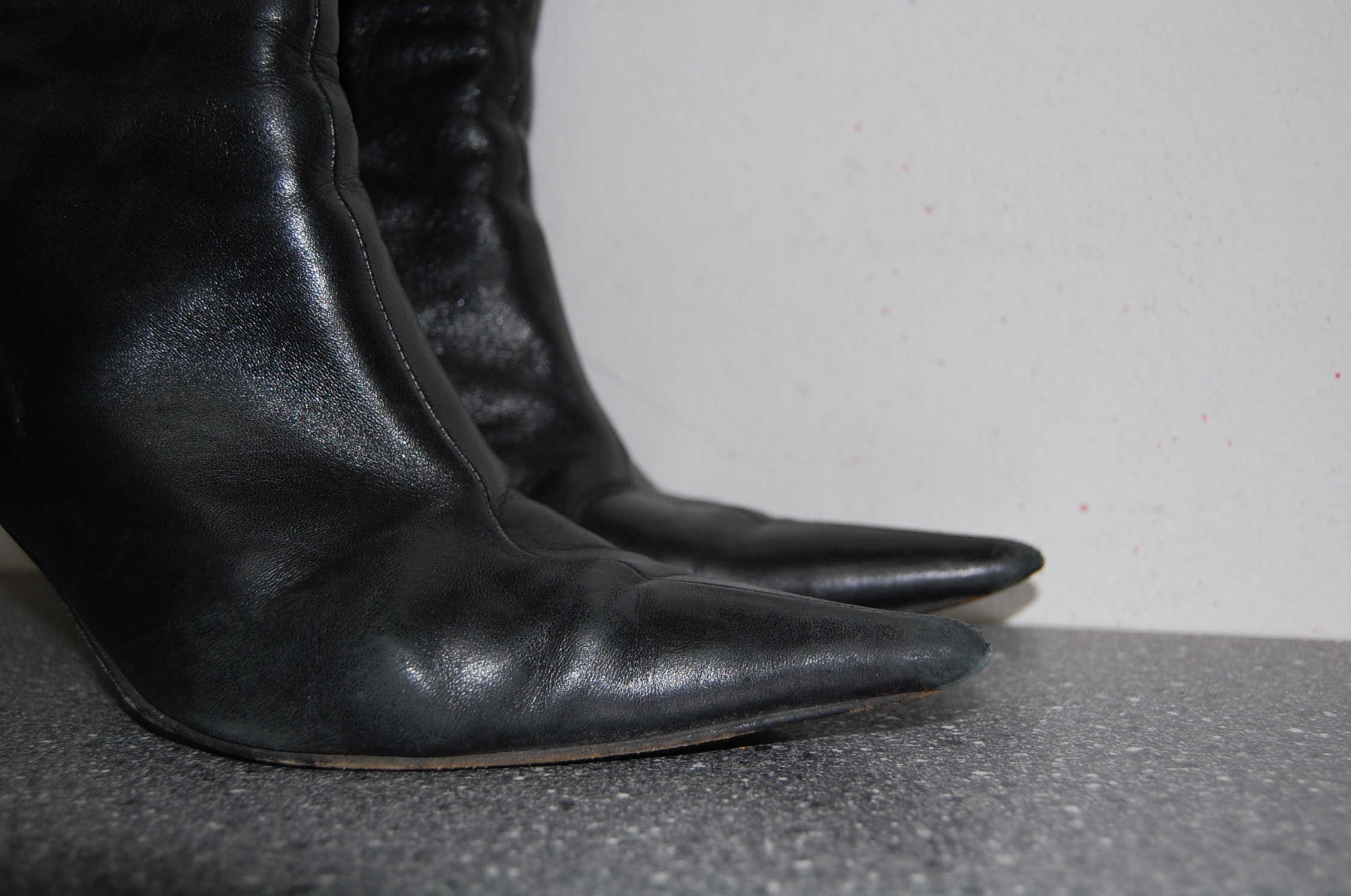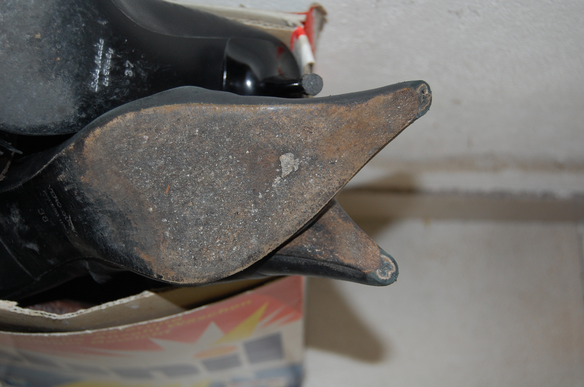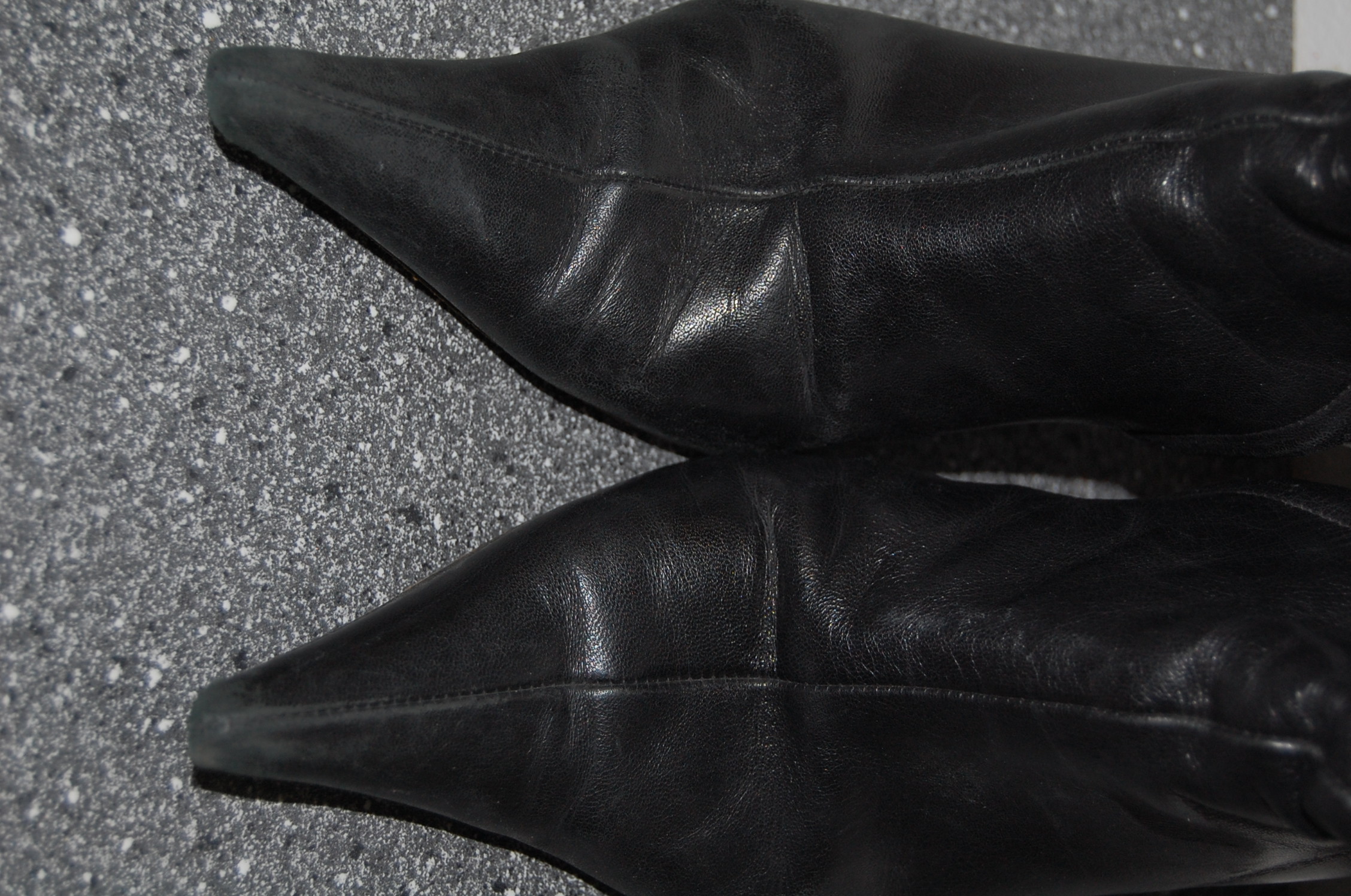 Meine Mum hat diese Stiefelletten sehr oft getragen und nicht nur in der Kanzlei, sondern auch beim Einkaufen, Bummeln usw. Vor diesem Hintergrund erscheinen die doch arg abgenutzten Spitzen als daraus resultierende Gebrauchsspuren.