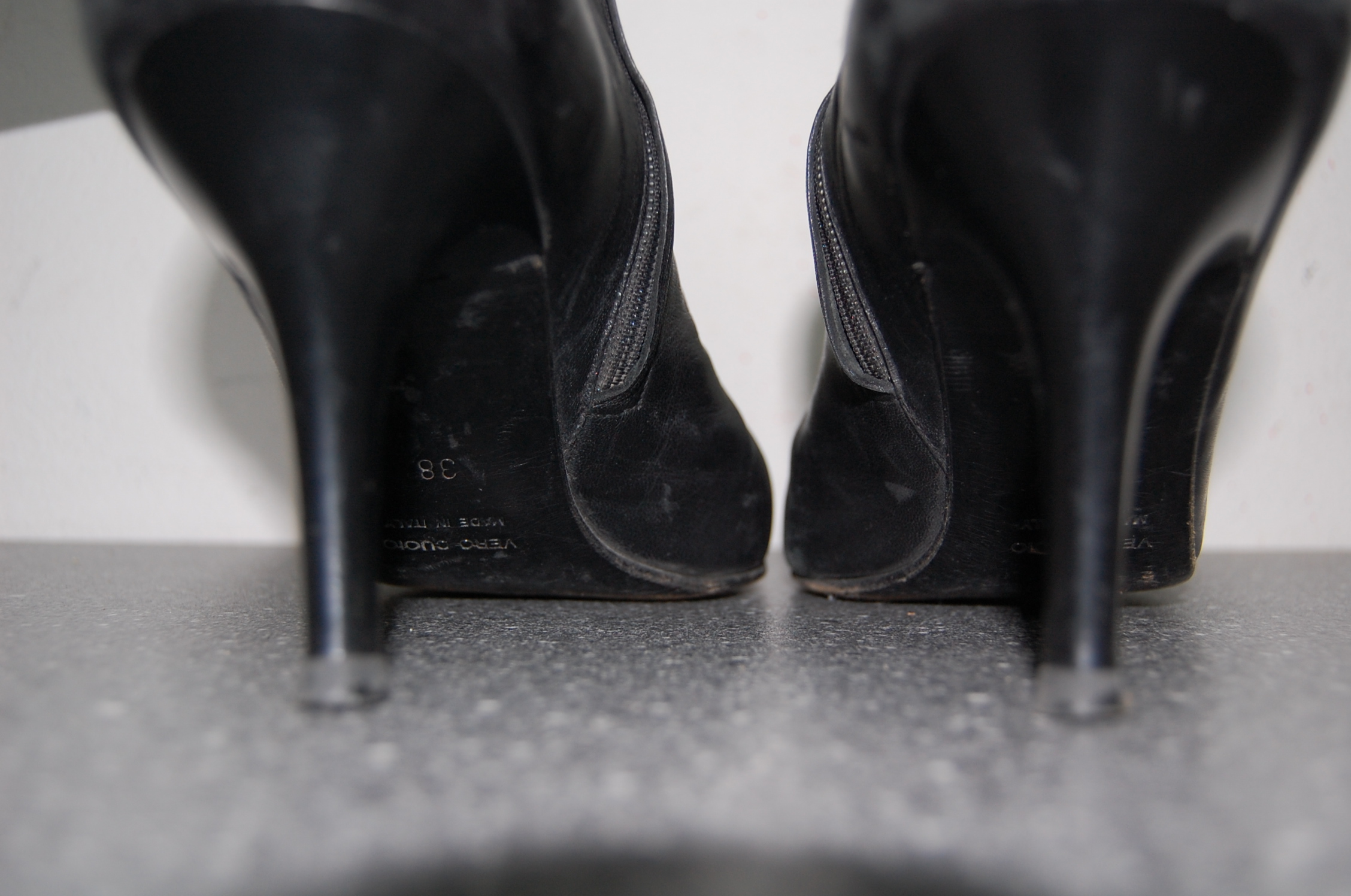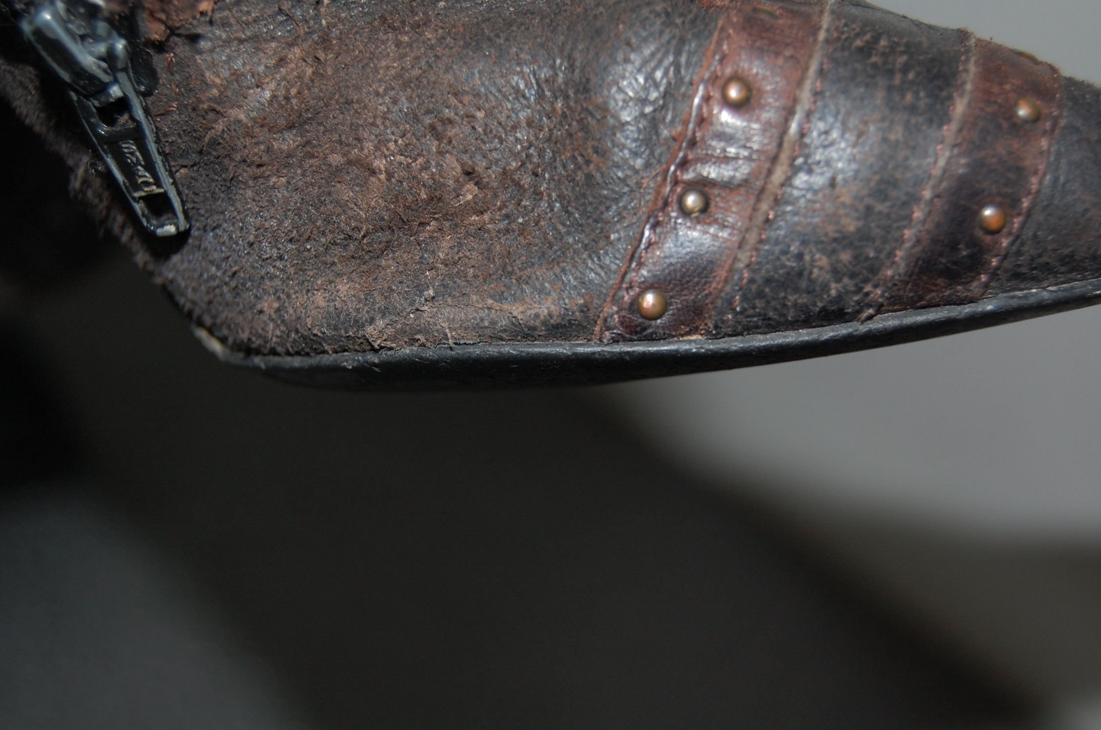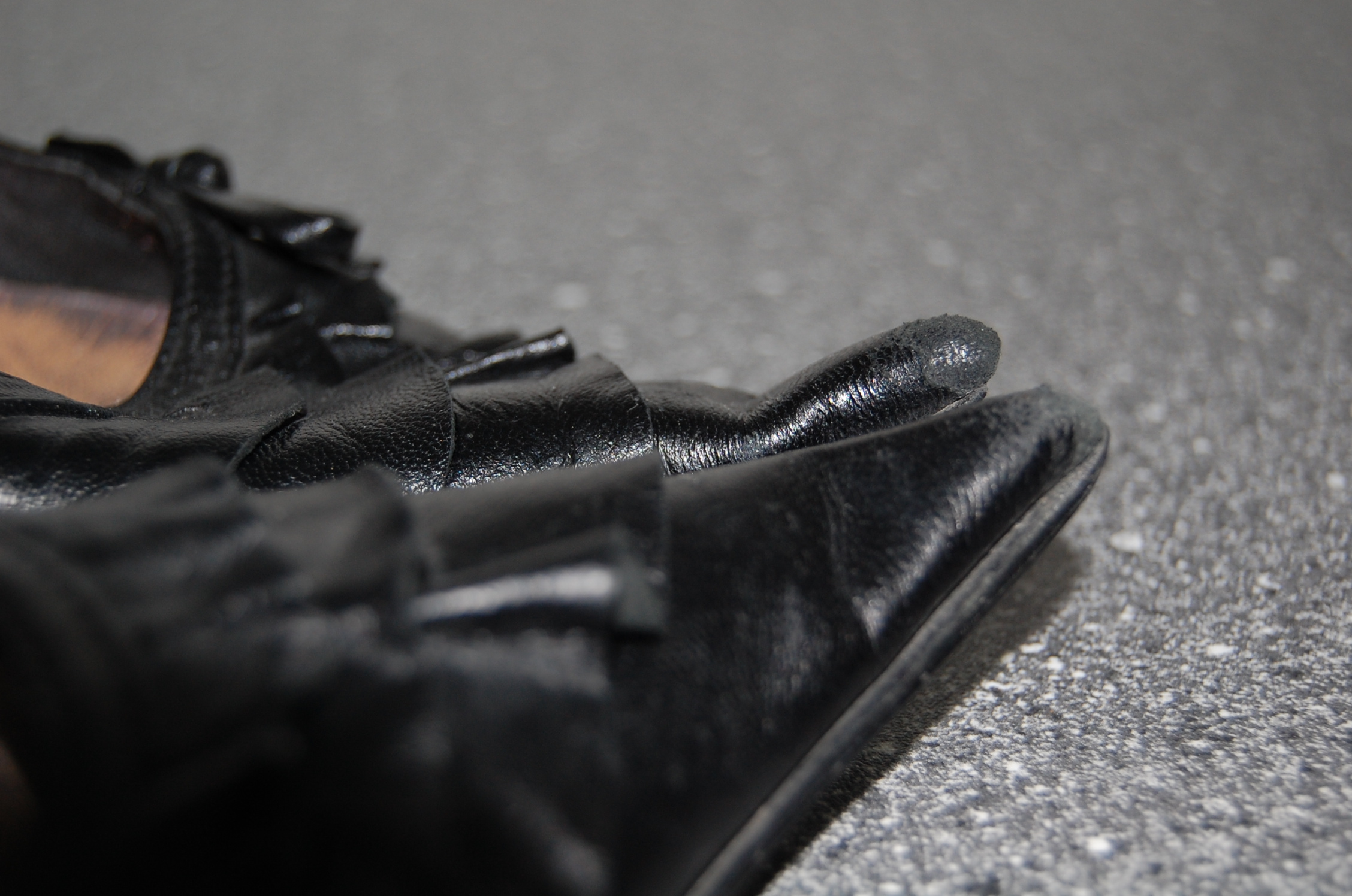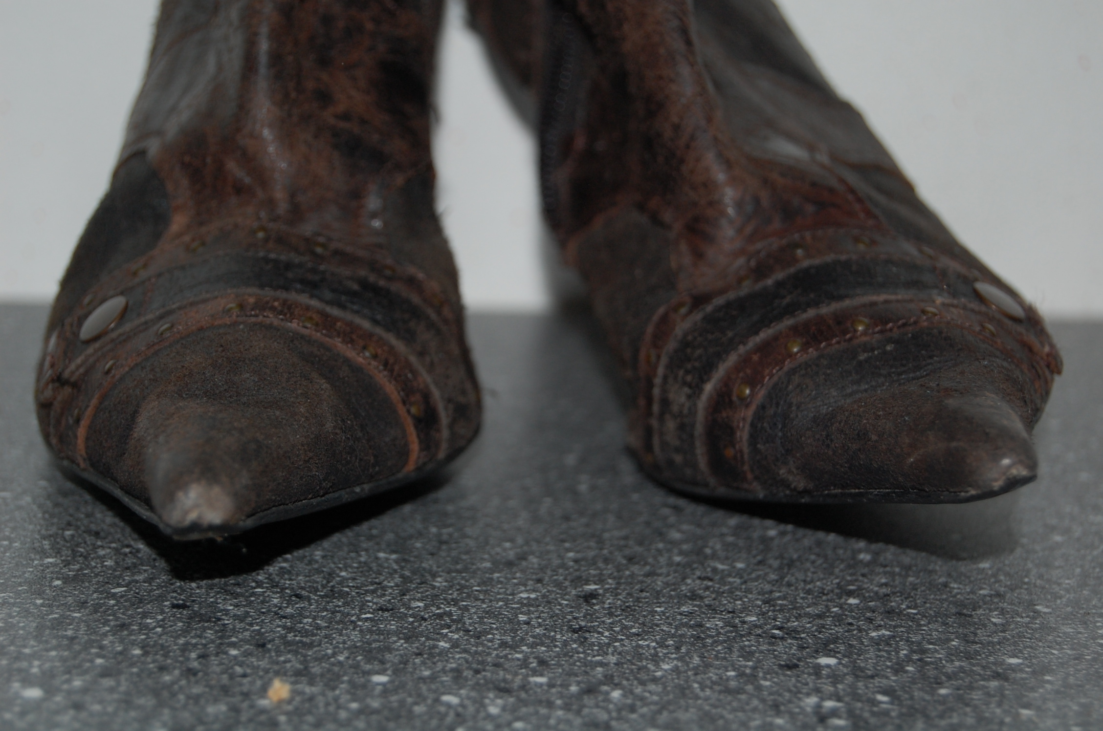 Meine Mum hat diese Stiefelletten sehr oft getragen und nicht nur in der Kanzlei, sondern auch beim Einkaufen, Bummeln usw. Vor diesem Hintergrund erscheinen die doch arg abgenutzten Spitzen als daraus resultierende Gebrauchsspuren.