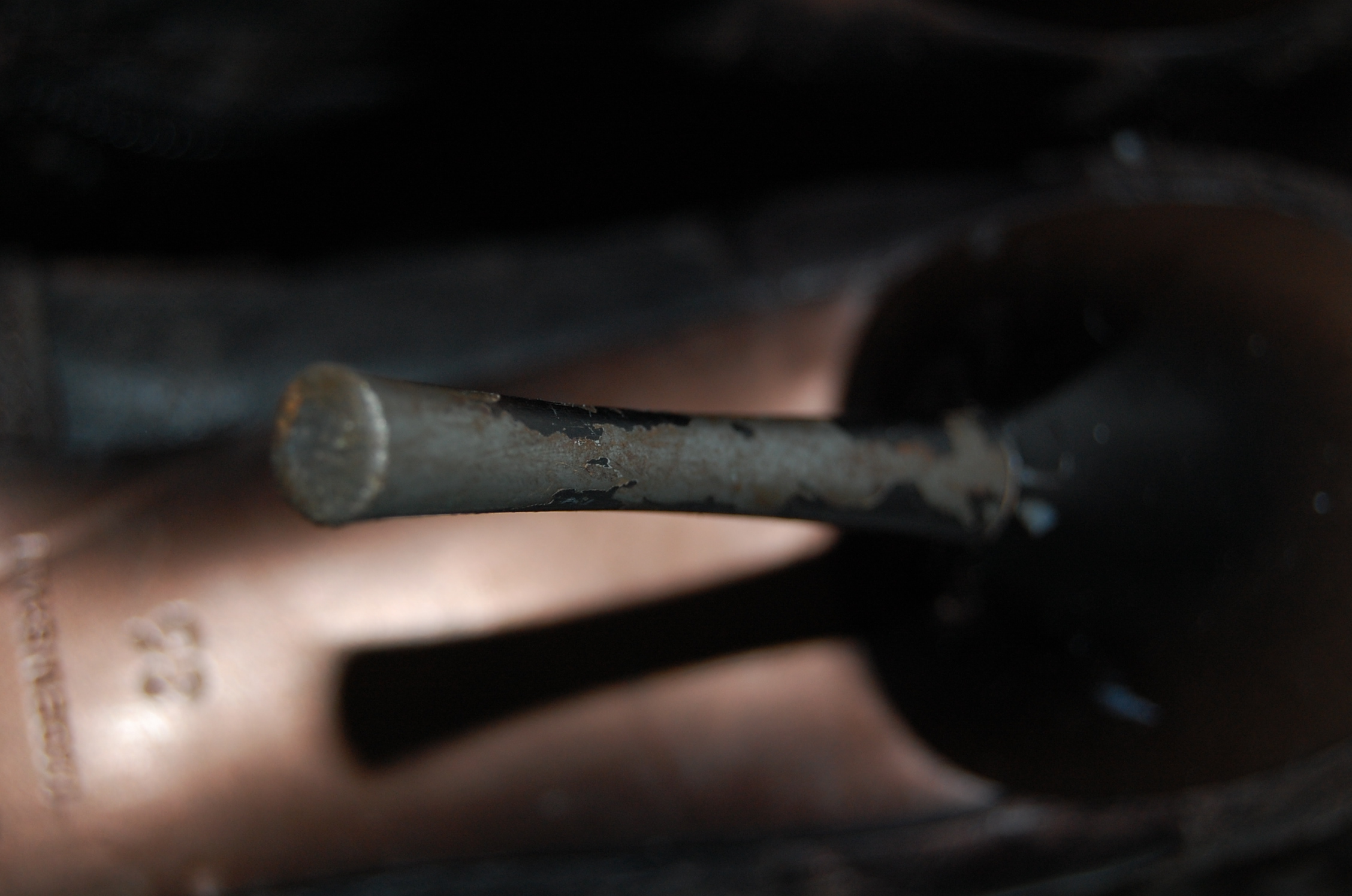 Geschont hat meine Mum diese Stiefel nicht. Die Laufflächen der Sohlen sind strak genutzt und wie man bei den Detailaufnahmen von der Seite erkennen kann, schon recht dünn. Diesen Effekt bestätigt ein angewandter Drucktest. Beim linken Stiefel ist das Spitzenplättchen bereits durch das Tragen soweit verschlissen, dass nur noch die Verbindung zum Konter in der Schuhspitze verblieben ist. Der Rest ist schon weg. Es ist davon auszugehen, dass die Heels einige Millimeter ihrer ursprünglichen Länge abnutzungsbedingt eingebüßt haben. Auch die Volllederinnenausstattung hat erheblich Gebrauchsspuren.