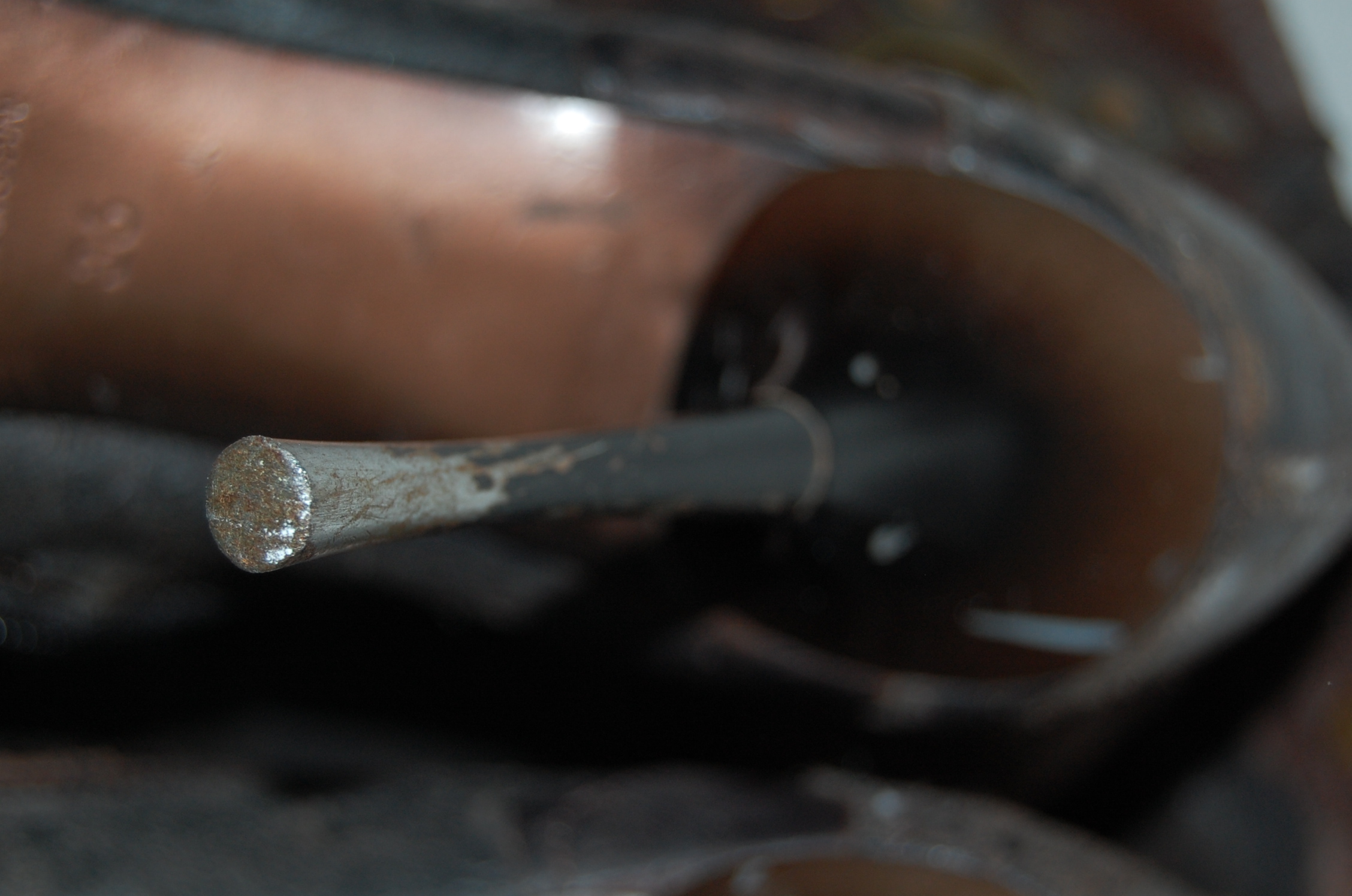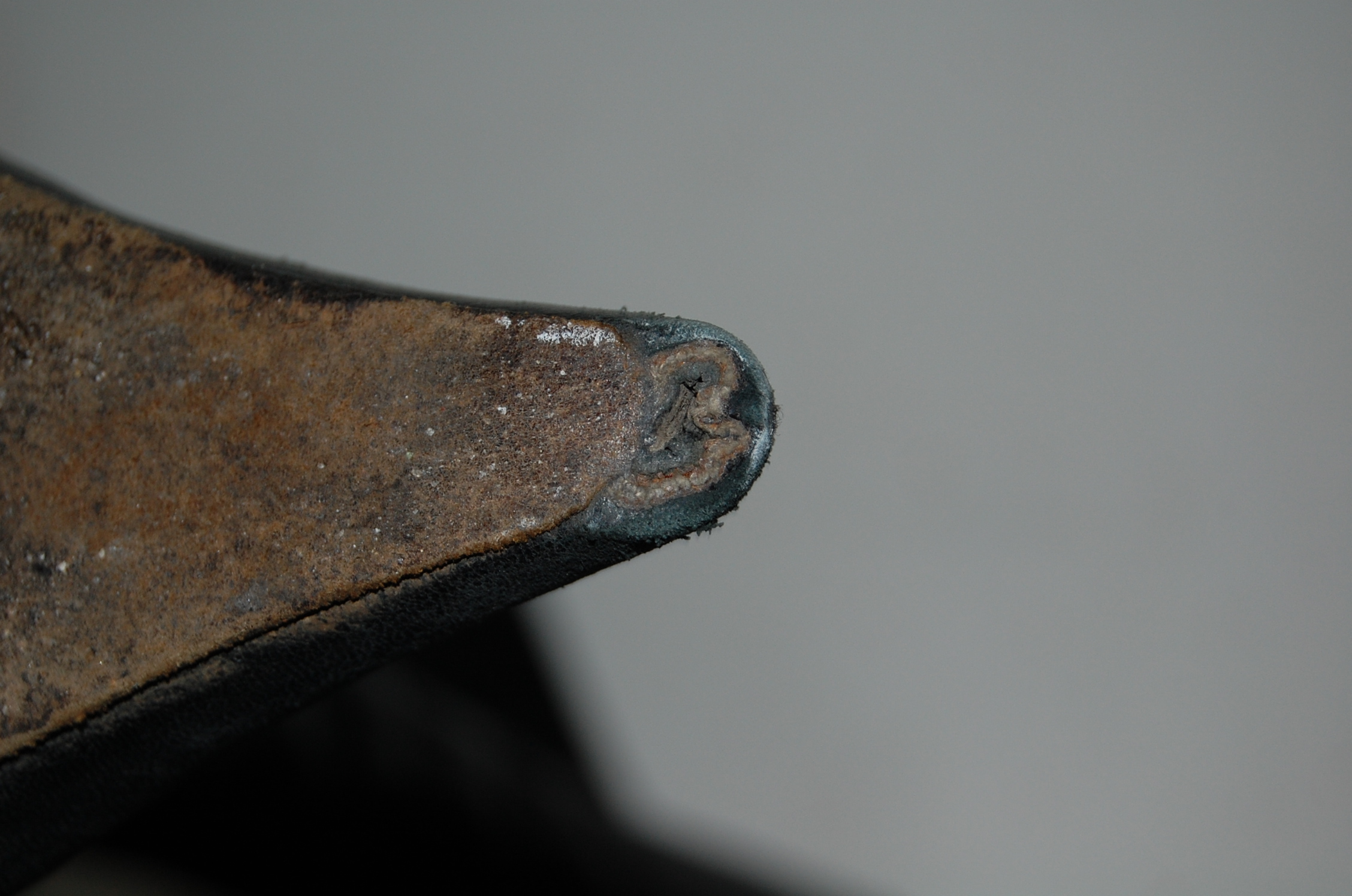 Die extremen Schuhspitzen sind sohlenseitig relativ gering abgewetzt. Ansonsten sind ist das Leder vorne, wie bei diesen Schuhen üblich, den alltäglichen Konfrontationen ausgesetzt gewesen.