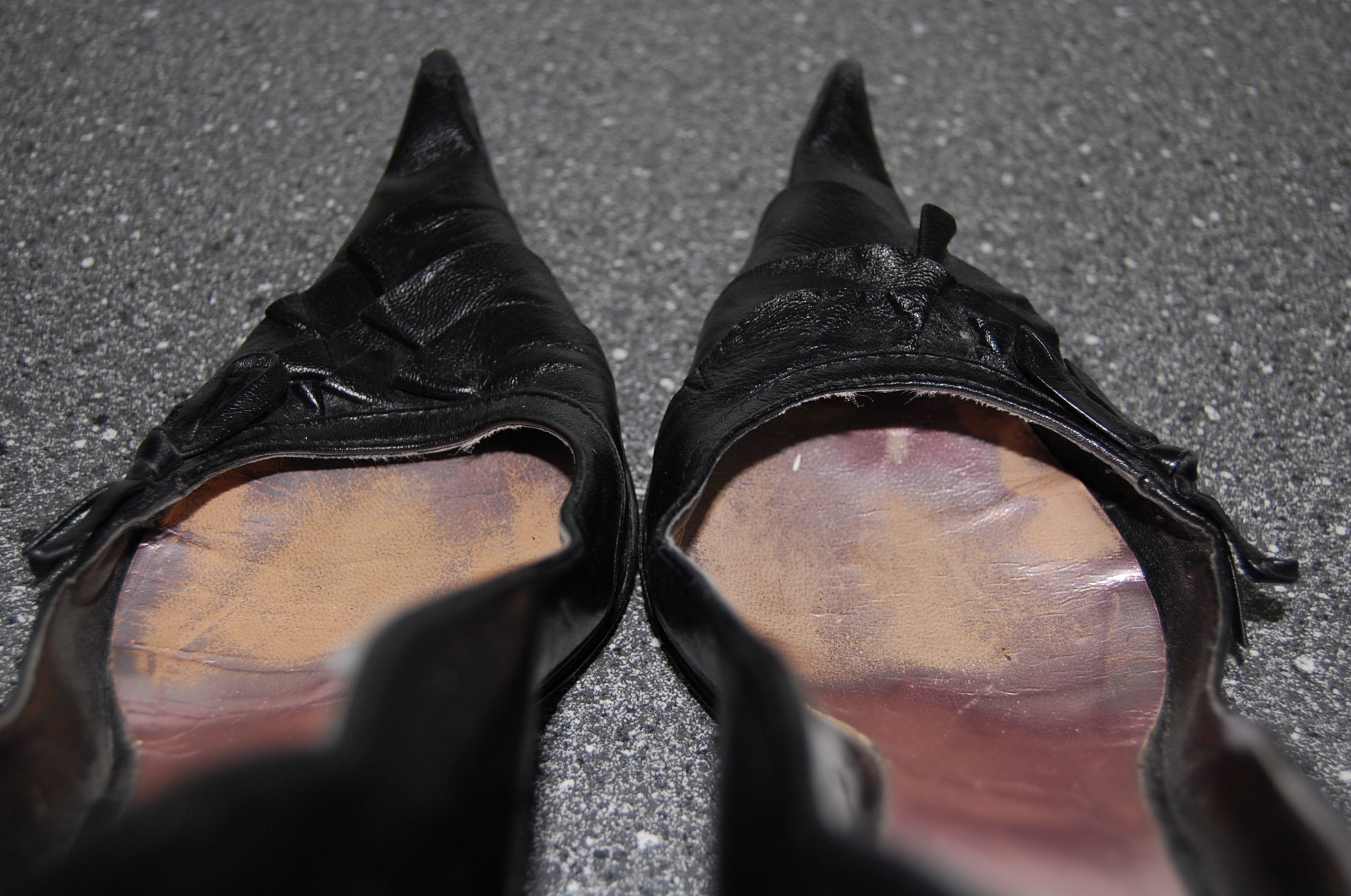Dieses Paar war wohl eines der am häufigsten getragenen Schuhe meiner Mum. Die leeren Spitzen sind massiv geknickt, die Heels haben Macken und die Hacken Abschürfungen vom Autofahren. Nicht vergessen zu erwähnen, möchte ich die deutlichen Abnutzungen des Innenbereiches. Die Sohle ist trotz des massiven Gebrauchs noch sehr fest und wenig verschlissen. Es handelt sich hier bei wohl um eine sehr gute Qualität.