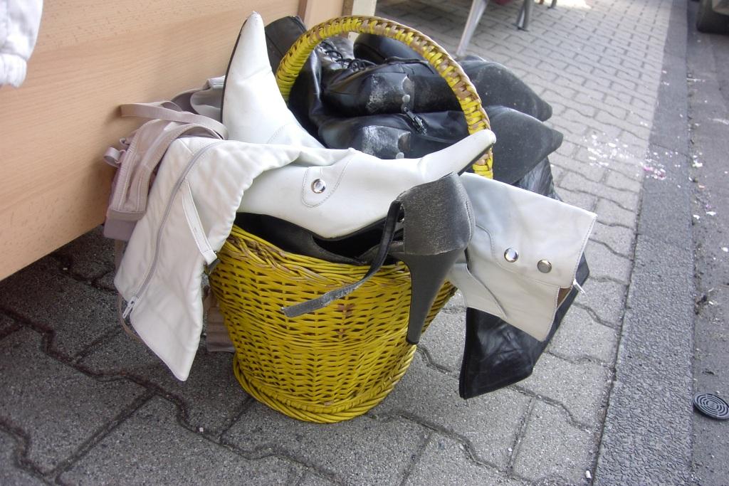 Die weißen Stiefel hatte meine Bekannte lieblos auf ihre silbernen Party-Pumps gedrückt und ebenfalls darunter ragte noch ein langer Lederschaft eines Stiefels hervor und die schwarzen hübschen Pumps mit dem noch recht makellosen silberfarbenen Innenleben sollten auch unwiderruflich in den Müll. Schade!