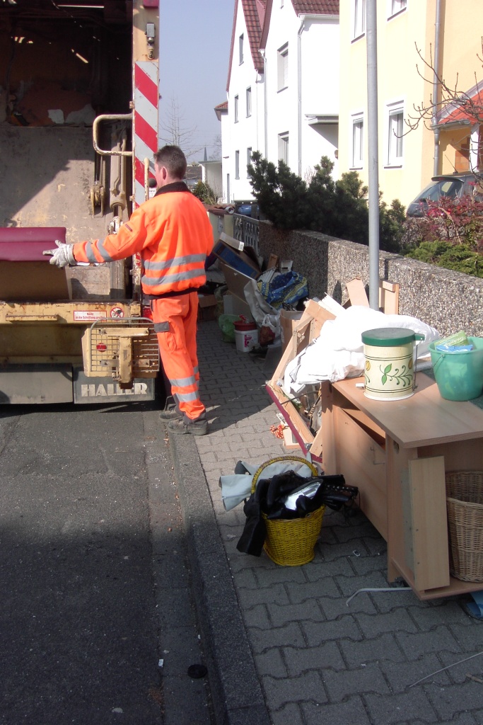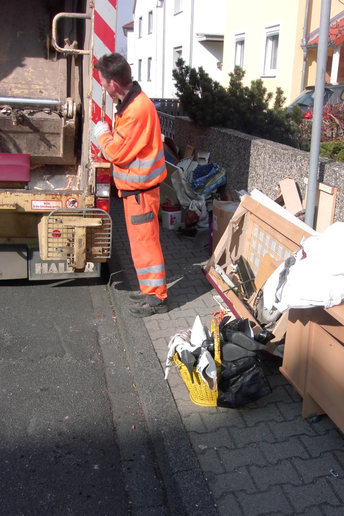 Während ein Sperrmüllauto durch die Straße fuhr und alles pressend und malmend abräumte, ging zuerst von mir unbemerkt eine junge Frau aus dem Hoftor und stellte etwas auf den Bürgersteig. Sie fragte die Mülwerker, ob die noch ihren Müllbeutel mitnehmen könnten, da ihre Mülltonne beim Nachbarn stand. Die Müllwerker meinten, dass sie das tun könnte, wenn sie "durchgepresst" hätten. Schnell noch stellte die Frau anderen Sperrmüll aus der Garage zum Haufen auf die Straße.