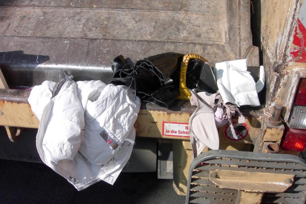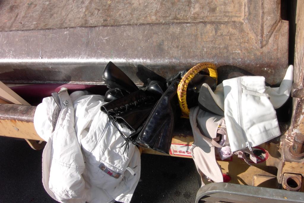haltet euch bitte vor Augen, dass diese Bilder doch eine ganz normale Sperrmüllabfuhr dokumentieren. Für die Jungs von der Müllabfuhr ist das nur loser Kleinmüll, der besser gleich über die Mülltonne entsorgt worden wäre, denn jetzt müssen die Müllmänner auch noch lose Stiefel und Wäscheteile zum Müllauto tragen. Mal ehrlich: Das kann doch nicht sein, wenn Müllmänner auch noch per Hand die verleierten BHs einer Frau von der Straße räumen müssen. ;) :oops: :mrgreen:
