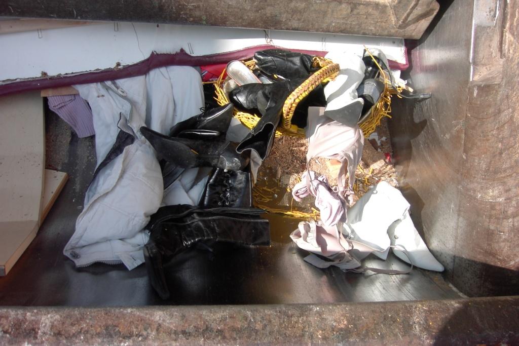 Die Presse hatte spätestens jetzt das ganze Gerümpel fest im Griff und die ehemals süßen Pumps und sexy Stiefel wurden in diesen Sekunden unwiderruflich zu gepresstem und versautem Sperrmüll.