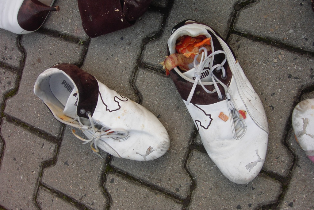 Zwischen holz- und Glassplittern ragten doch tatsächlich Fußballstollenschuhe, die schwarzen adidas-Hartplatzschuhe, Laufschuhe und irgendwo sicherlich auch das zermalmte Wildlederstiefelpaar!