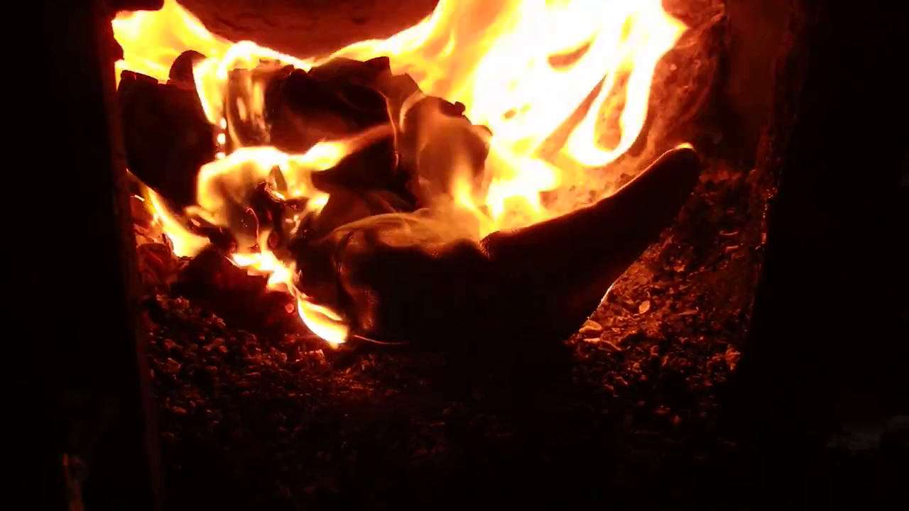 Ein Genuß für alle Sinne: Von mir einige Tage als Schneeräum- und Heizkeller-Arbeitsschuhe getragene Synthetikstiefel vom Sperrmüll dienen ím Winter nun selbst der Beheizung unseres Hauses. Üblicherweise kommen bei mir alle Schuhe in den bereits "heißen" Ofen und müssen nicht lange Leiden. Der Anblick brennender Stiefel erregt mein "Bärchen" in unbeschreiblicher Weise ...