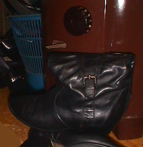 Plötzlich hatte sie einen schwarzen Lederstiefel in der Hand, war gerade dabei, ihn vor der bereits offenen Feuertür "ofengerecht" zu Wickeln.