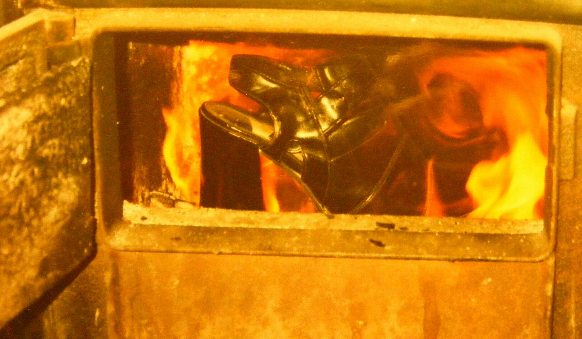 Dann holte Mutter ein Paar lange weiße Lackleder-Plateau-Schnürstiefel aus dem Paket, ... Mutter fädelte die Schnürsenkel aus den Schäften, rollte die Schäfte zusammen und verschnürte die Stiefel mit den Schuhbändern zu zwei kompakten Päckchen. Mutter hob mit dem Feuerhaken die aufklappbare Herdplatte an und legte das erste Päckchen von oben in die Kohlenglut auf den Rost. Dann schloß meine Mutter wieder die Herdplatte. Der Stiefel begann zu brennen, sodaß sich die Herdplatte wieder etwas anhob. Darauf stellte sie dann den Kartoffeltopf und sie öffnete ein wenig die Feuertür des Herdes, es tobte ein bestialischer Feuersturm! Das Ofenrohr begann langsam zu glühen. Schnürösen fielen klappernd in den Aschekasten. Nach wenigen Minuten hatte der erste Plateaustiefel seinen Kampf gegen das Feuer verloren. Meine Mutter kommentierte an der offenen Herdtür zufrieden die vollständige Verbrennung, ich selbst sah auch hinein und erblickte grasgrüne Ascheflocken über der noch aktiven Kohlenglut. Mit dem Zweiten dasselbe noch einmal.