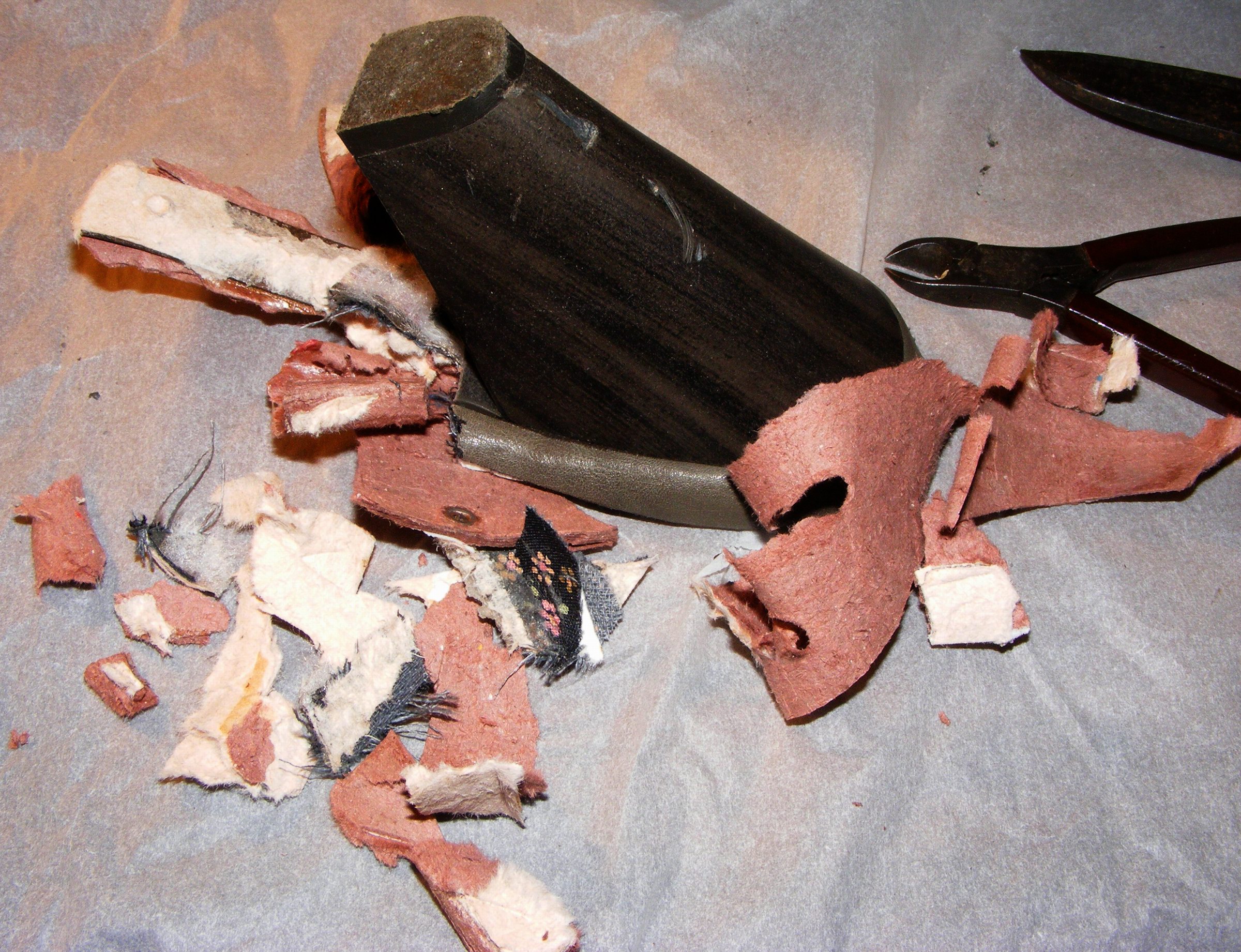 Da mußte ich die Zerlegung so "schonend" durchführen, daß die Absätze dabei keinen Schaden nehmen. Ihr seht hier also das "vorläufige Endergebnis"; die Absatznägel werden später mit einem Lötkolben erhitzt und dann Herausgezogen.
