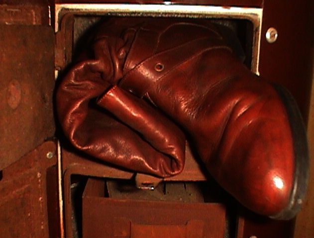 An einem späteren Abend heizte ich den Badeofen an und nahm einen der Reitstiefel aus dem Kohleneimer, um damit "Nachzulegen". Als ich ihn zusammenwickelte, sah ich, daß er Größe 40/7 hatte und probierte das Paar sofort an. Na ja, die Stiefel waren, weil sie vorher nur mit Größe 38 Getragen und noch nie Eingekremt wurden, an den Füßen ein Wenig eng, die Schäfte aber waren angenehm reichlich weit! Ich fütterte den Badeofen also nun mit anderen "Brennschuhen" und knetete in der Wärme vor der offenen Feuertür die Spitzen "weich", was natürlich im Zusammenhang mit den im Ofen fackelnden Pumps und Ballerinas ein ganz besonders genußvolles Erlebnis