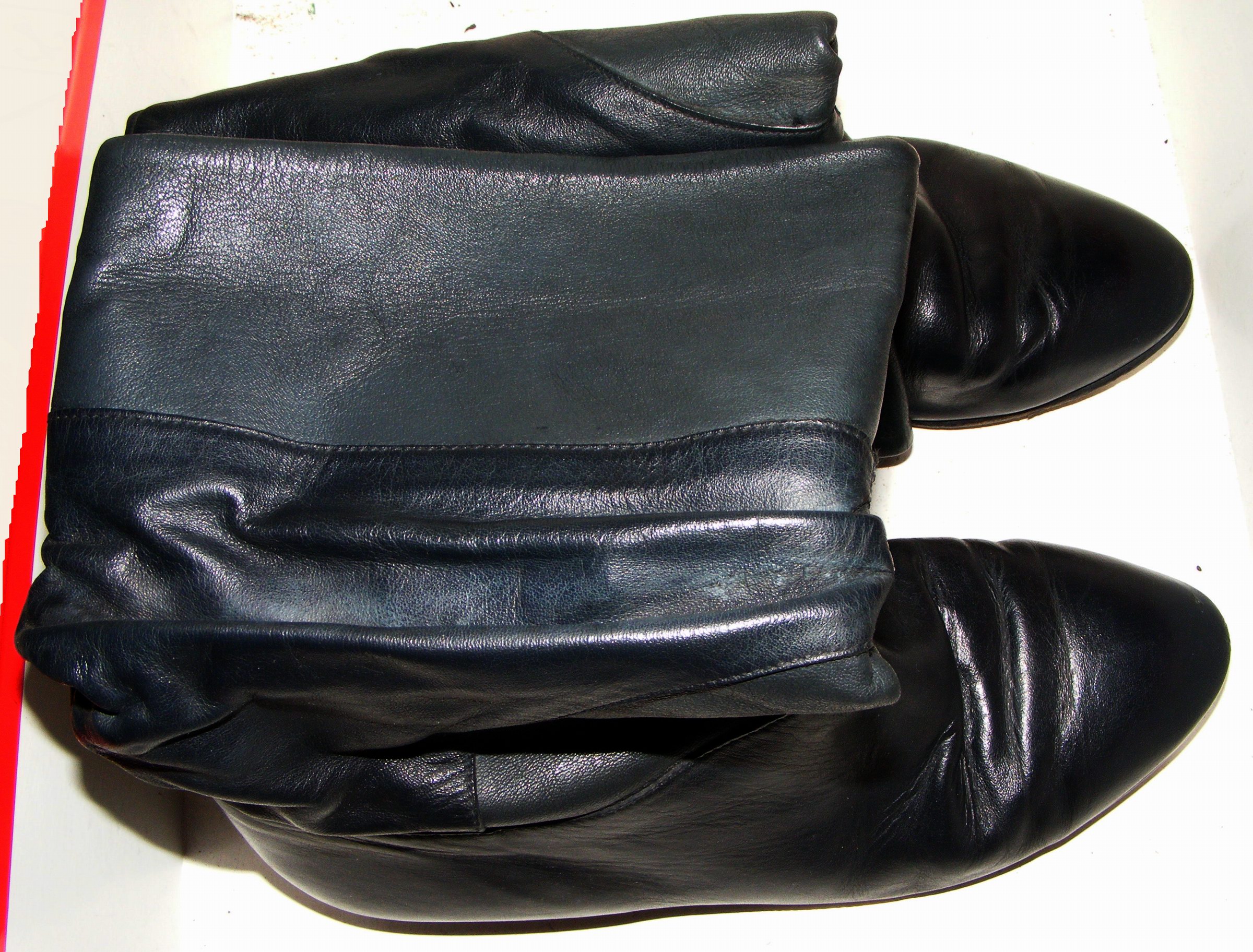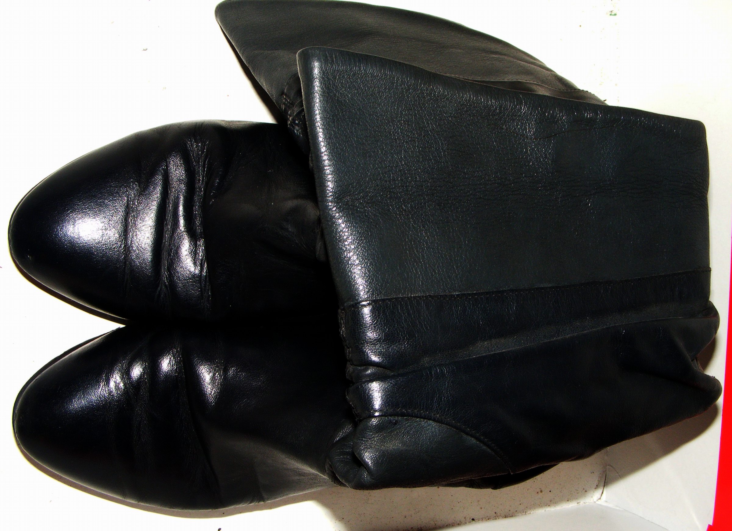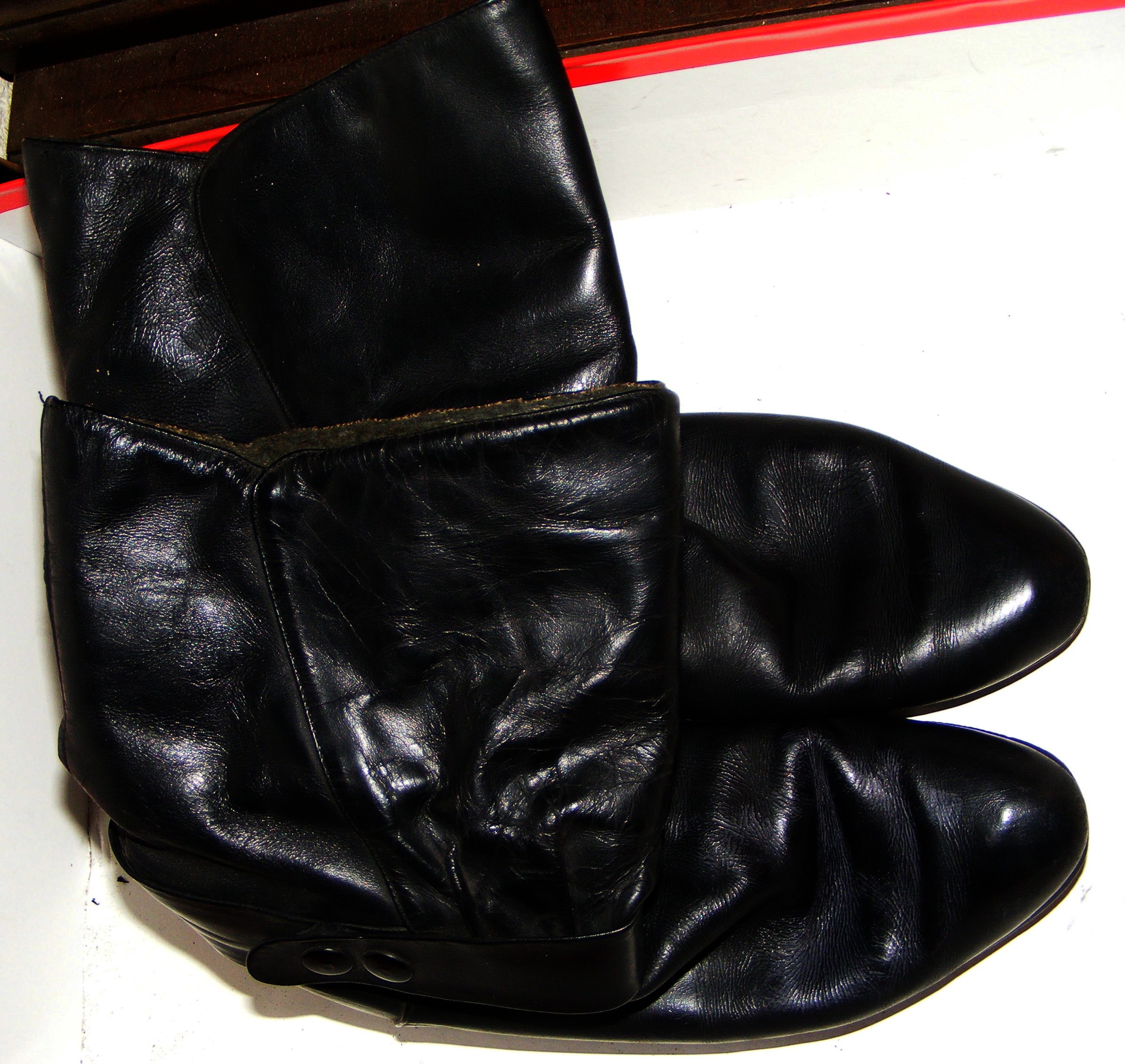 An diesem Tag wollte ich die erstmals gekaufte Erdal-Schuhkreme ausprobieren - dazu kam mir der hart getrocknete, schimmlige Stiefel gerade recht. Also testete ich die Kreme ausgiebig an ihm, ließ ihn einige Tage stehen. Ich beobachtete, daß die Kreme perfekt die Kratzer und Schimmelflecken verschwinden ließ und wie das Leder nach mehrmaliger Behandlung butterweich wurde. Ich kremte nun auch den zweiten Stiefel ein und machte gleichzeitig bei der ursprünglichen Größe 39 den Dehnungstest um eine Nummer, indem ich die Stiefel zu Hause trug. Nach einigen Tagen waren die Stiefelchen paßgerecht Eingetragen und ich führte sie "auf die Straße" aus; machte sogar mit ihnen meinen seinerzeitigen Freund "scharf". :P