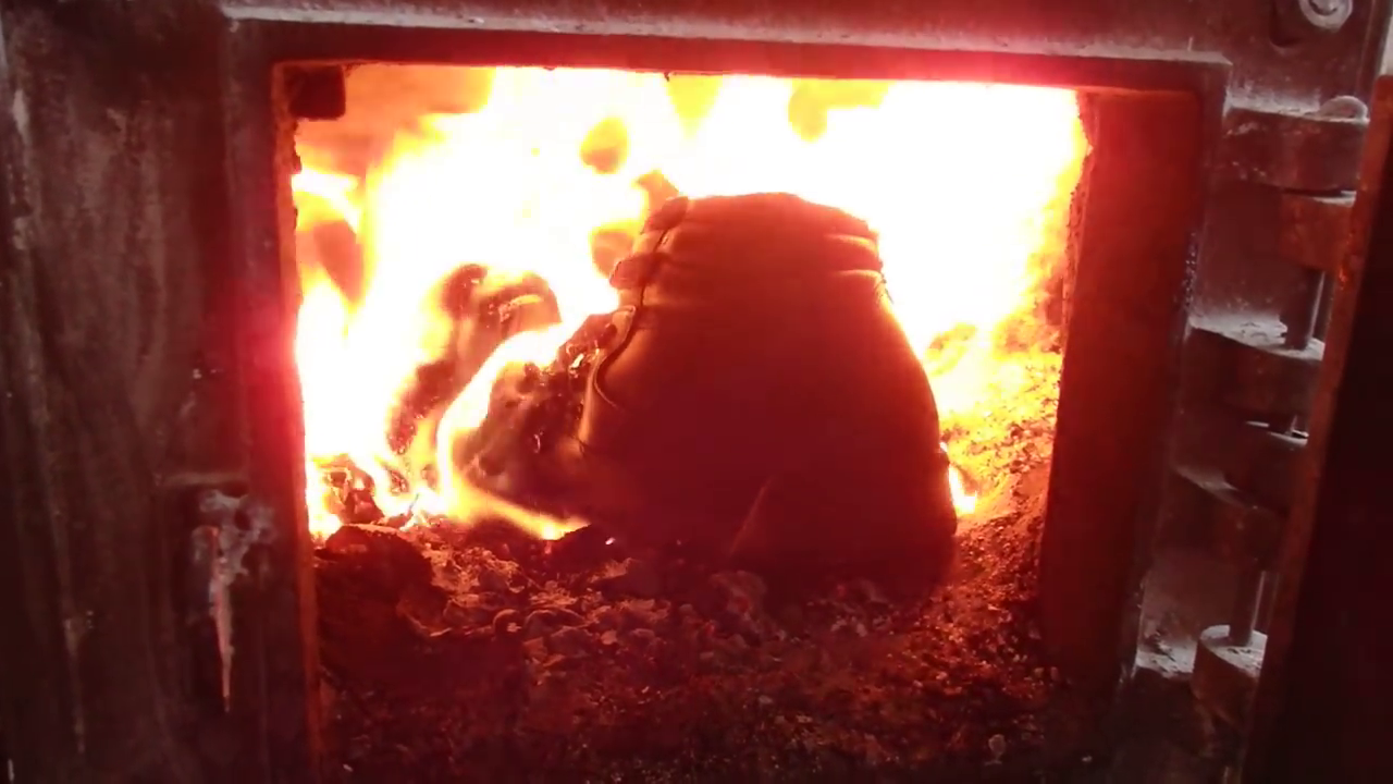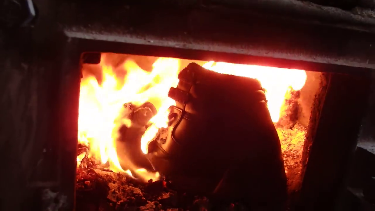 Dabei trug ich meine neu gekürten schwarzen Arbeitsstiefel und setzte mich vor den Herd. Ich stellte den ersten Schuh auf die vorbereitete Holzglut und ließ die Feuertür offen. Langsam begann er von der Spitze her zu Brennen. Dieses erregende Knistern des brennenden Lackleders und der herrliche Ledergeruch erinnerten mich an meine Kindheit, als meine Mutter meine und ihre Lackschuhe im Küchenherd verbrannte. Ich starrte in die Flammen, die von der sich nach oben biegenden Spitze an der Spange hocharbeiteten. Gerade als die Schnalle, vom Feuer gelöst, auf den Rost fiel, bewegte sich die Sohle fauchend von der Spitze, erzeugte eine wahnsinnige Hitze. So begann auch der Absatz in voller Ausdehnung zu Brennen. Die vordere Hälfte des Schuhes, einschließlich der Spangenbänder, war bereits fast völlig verschwunden, nur der Absatz mit der verstärkten Hacke stütze sich auf dem freigelegten Federeisen ab, bis auch dieser Teil umkippte und auf dem Rost verglühte. Es wurde Zeit für den zweiten Schuh. Ich faßte ihn an der Hacke und mit der Spitze ordnete ich das Glutbett für seine Einäscherung. Ich stellte ihn sogleich ebenfalls in die vorbereitete Glutmulde und beobachtete noch ein Wenig , bis wieder die Spitze völlig brannte. Doch diesmal wollte ich in den Genuß der typischen Brenngeräusche kommen und ich schloß die Feuertür bis auf einen kleinen Spalt. Im Gegensatz zum Ersten brannte der zweite Schuh wie wahnsinnig, ein Feuersturm brach los, der das Knistern des Lackleders weit übertönte. Die Herdplatte begann zu Glühen und bereits nach etwa zwei Minuten war wieder Ruhe im Herd.