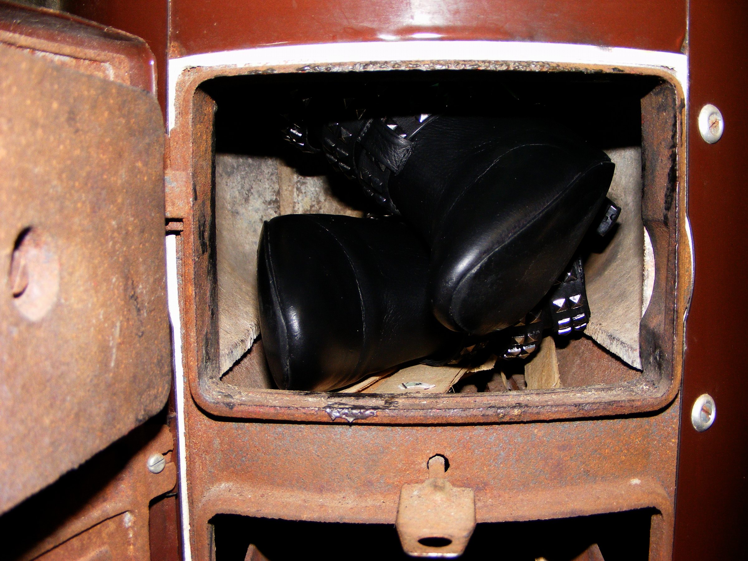 Je nach dem, wie viel Energie ich zum Kochen oder Heizen in der Küche benötige, kommt es auch manchmal vor, daß ein Stiefelpaar zwei Tage für seine Entsorgung benötigt, einer liegt dann noch allein vor dem Herd, bis auch er an der Reihe ist.