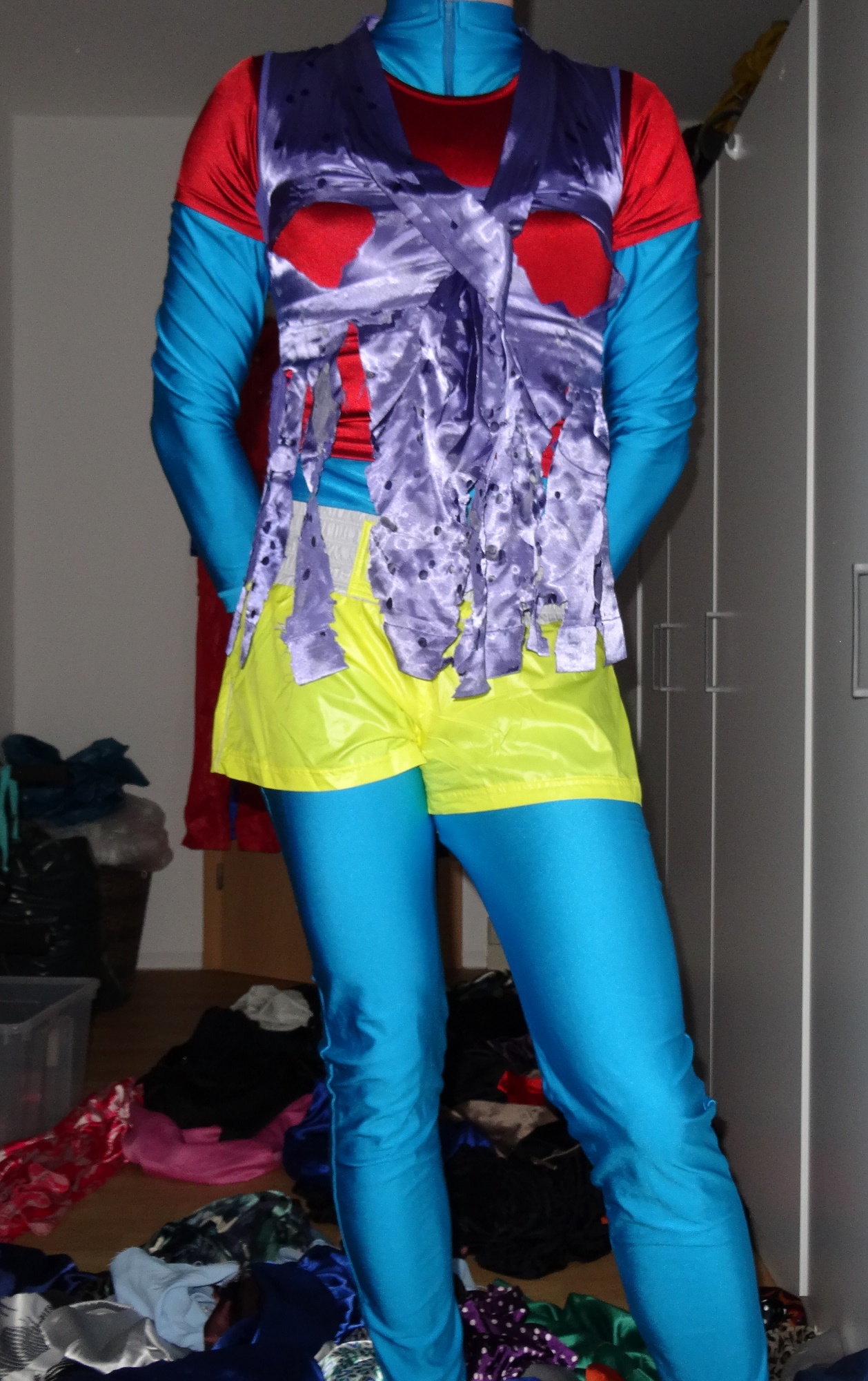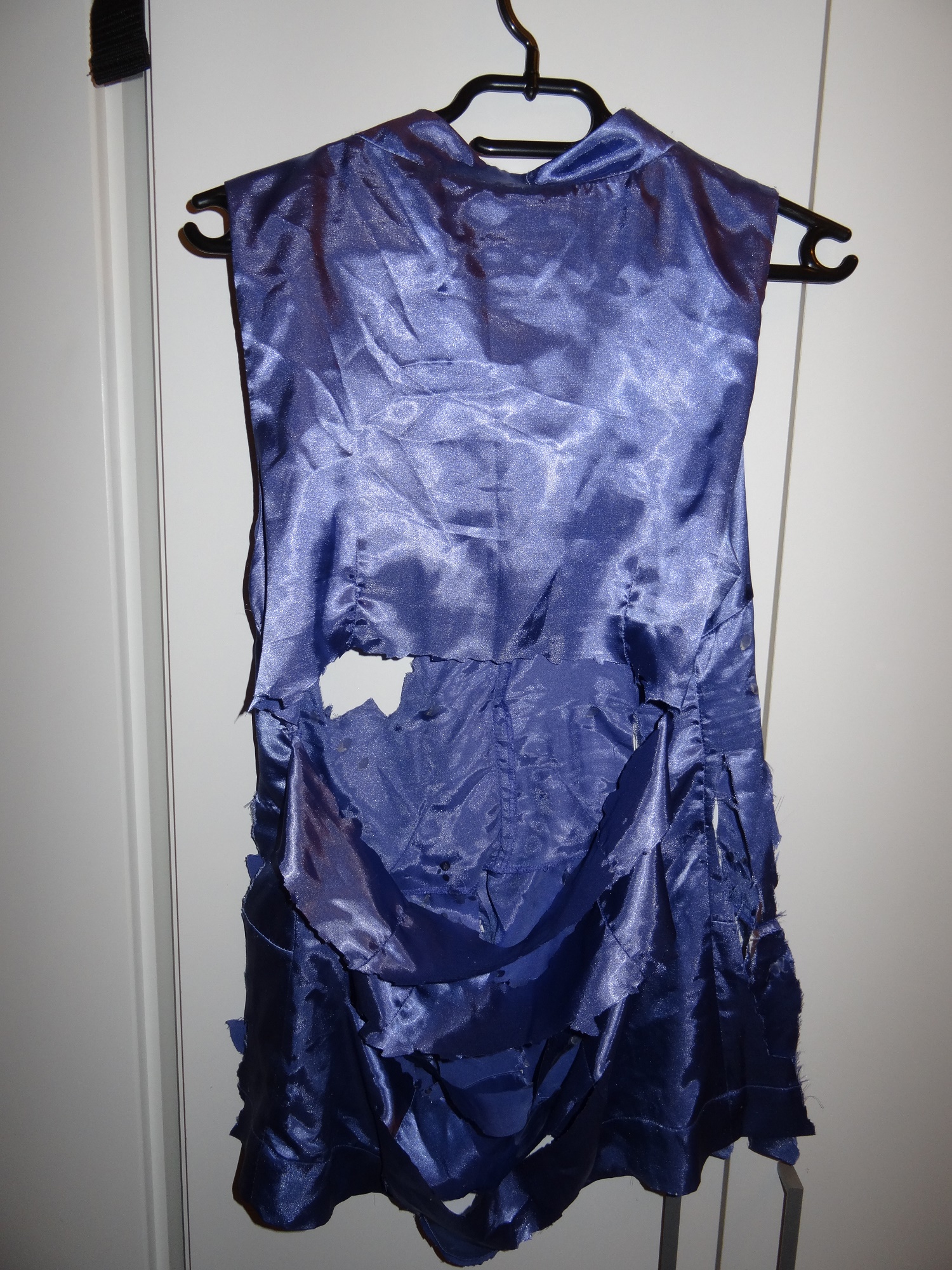 Sehr schön. Auch die 2 Löcher. Nun würde ich von unten her bis unterhalb der brust alle paar cm längsstreifen rein reisen.