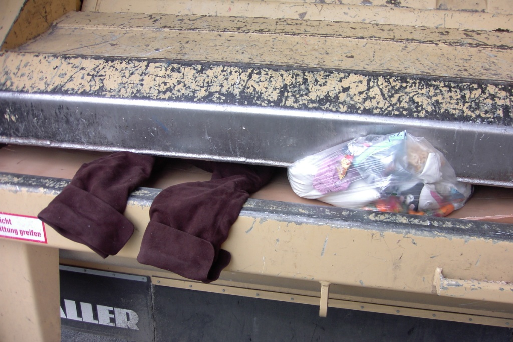 Kraftlos hing die eingeklemmte Jacke meiner Bekannten lappig herunter und der zermalmte Korb plumpste nochmal ächzend in die Müllschüttung zurück. Den Absatz des silbernen Partypumps hatte es übel erwischt.