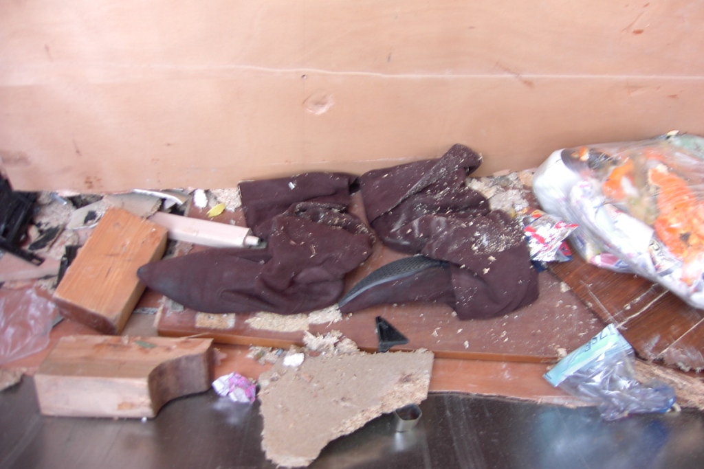 beim eingehenden Betrachten der Bilder dieser Serie, fiel mir dieses Bild auf, welches noch vor dem Pressen des Küchenmüllbeutels und der braunen Stiefel entstand. Es zeigt gerade das Zermalmen des von mir gar nicht beachteten Schuhschranks. Jetzt seht doch mal genauer hin. :o