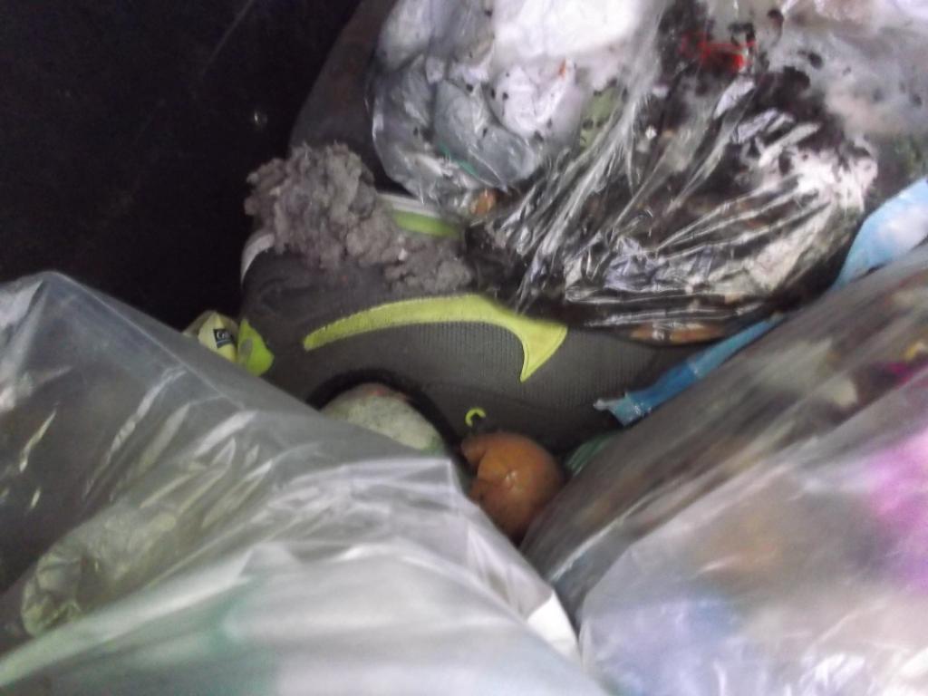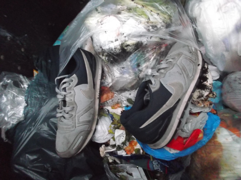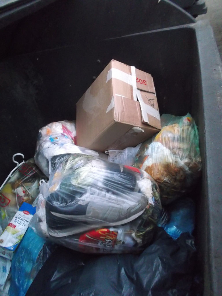 in aller Regel findet man geile Abfälle in Restmüllcontainern von Wohnanlagen als "anonyme" Abfälle, aber ab und an kann man leicht herausfinden, von wem die Abfälle stammen. So war es hier an einem recht kalten Tag und nur ein Küchenmüllbeutel mit Sneaks und ein Karton waren noch etwas warm von der Wohnung, welche sie gerade für immer verlassen mussten.