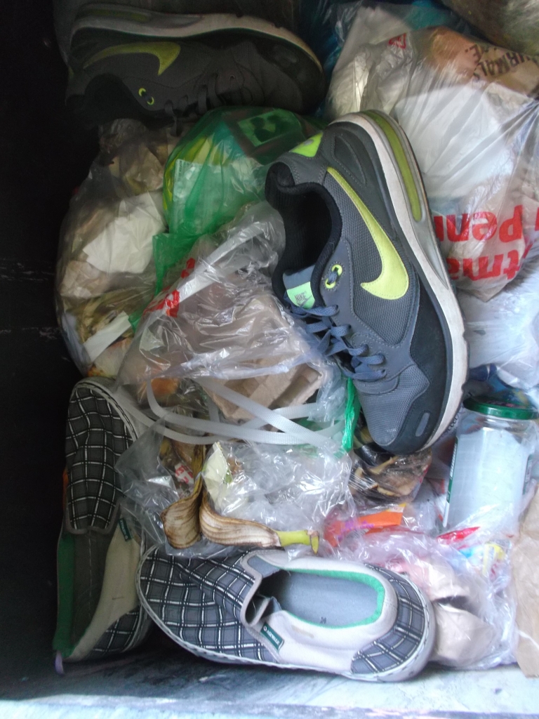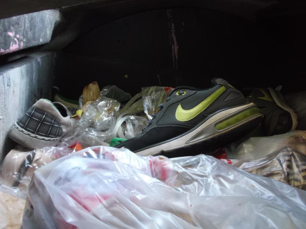 bei dieser Gelegenheit habe ich mal die Kaltblütigkeit besessen zu warten und zu dokumentieren, wie geile Kultsneaks herzlos von den Mitbewohnern mit ihrem Müll verschüttet wurden; keine Rettung, nichtmal ein kurzes Herausnehmen und Prüfen. Für die vielen Mitbewohner waren die beiden Sneakerpaare genau so "Igitt" bzw. "wertlos" wie eine faule Bananenschale oder abgenagte Knochen. Entsprechend auch diese nun folgende Vermüllung: