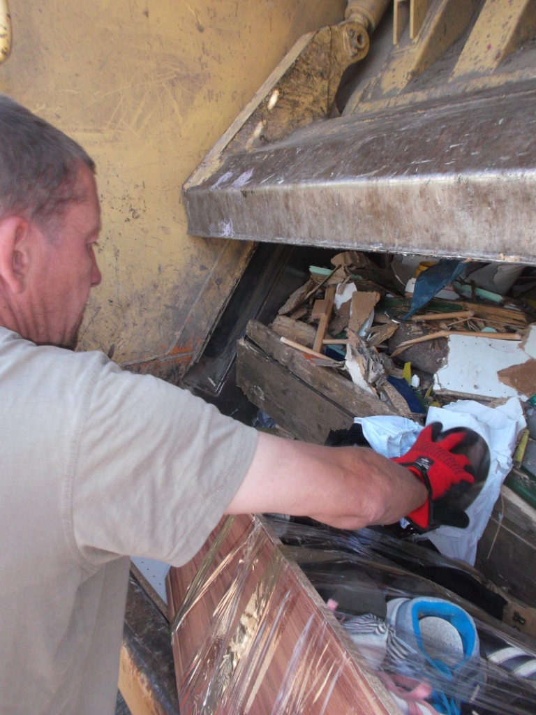 Die Müllschüttung leer pressen für den nächsten Schwung Möbelteile zum Pressen.