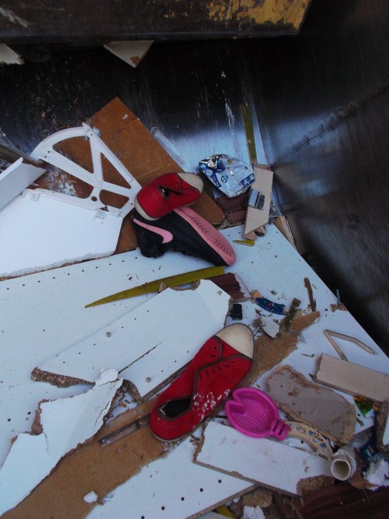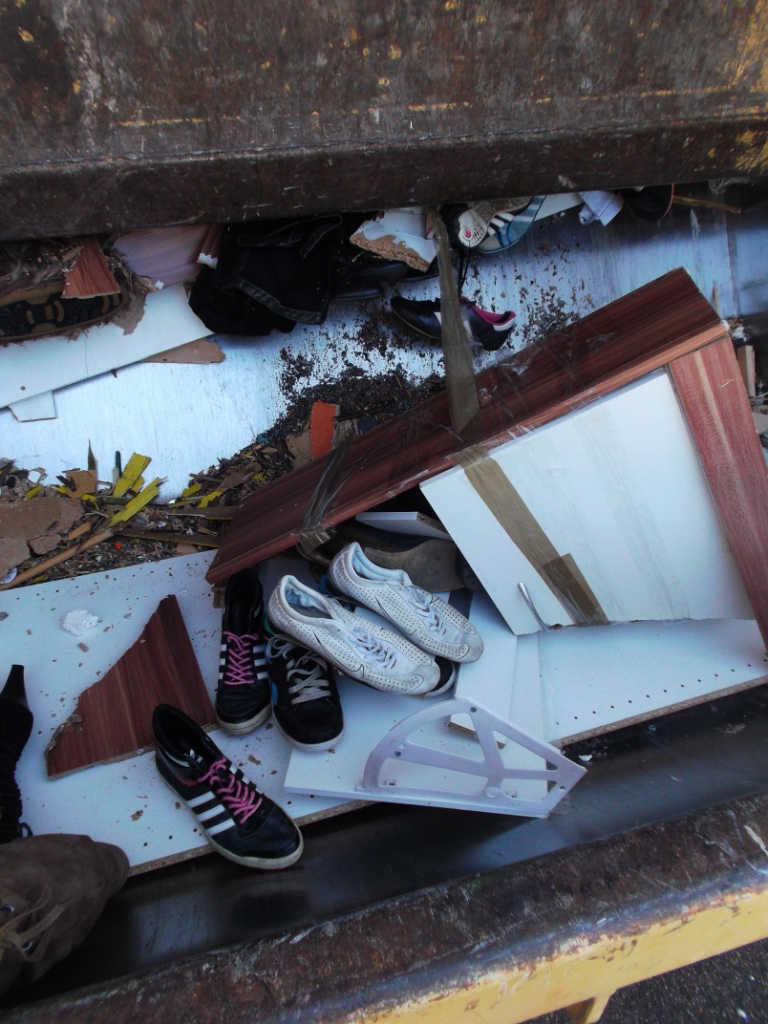 ich freute mich gerade über den geborgenen "Sneakerschatz", als schon das nächste Gerümpel zum Pressen eingeladen wurde und entdeckte etwas zu spät ein weiteres Paar des Mädels. So entschloss ich mich diesmal nicht einzugreifen und dem Sperrmüll-Schicksal seinen Lauf zu lassen, aber es solange wie möglich zu dokumentieren: :twisted: