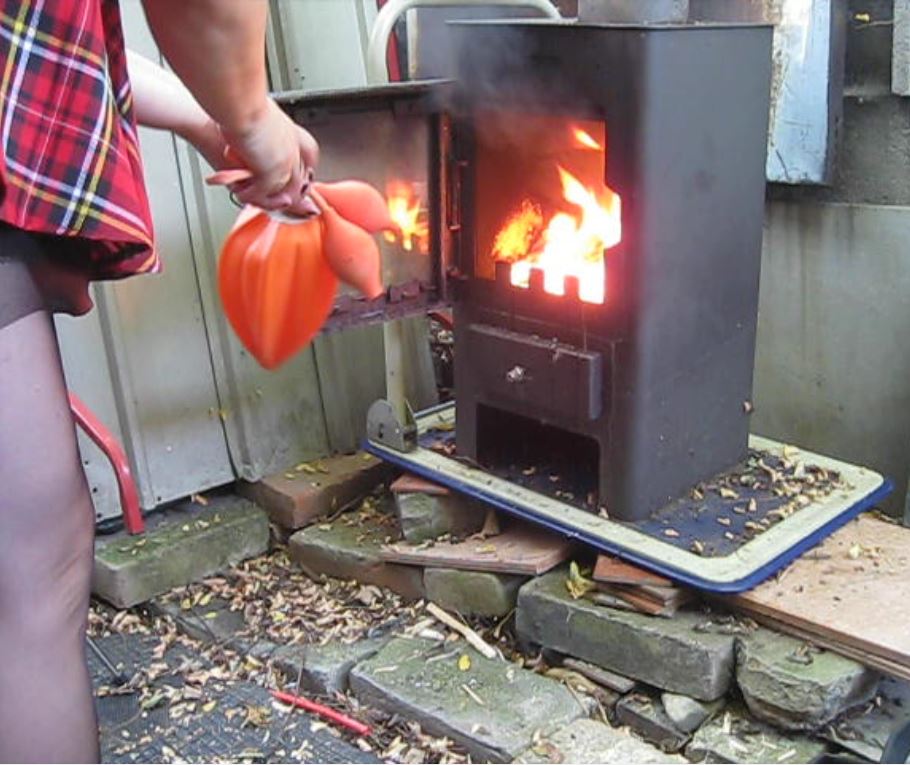 Nun, die "gefüllte Strumpfhose" ist zwar nicht im Ofen aber auf einem Gummifeuer, in das ein Autoschlauch geworfen wurde gelandet.