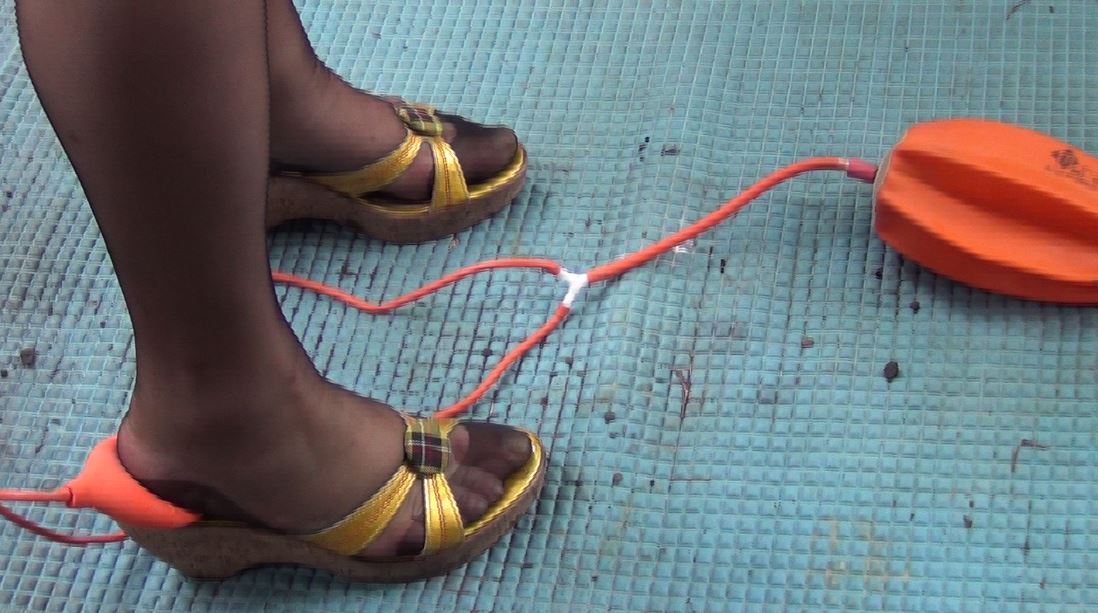 Nun , getreten von schwarzen nylonbestrumpften Füßen landet wieder eine aufgepumpte Gummifussballblase mit den beiden Gummipumpbällen im Feuer...
