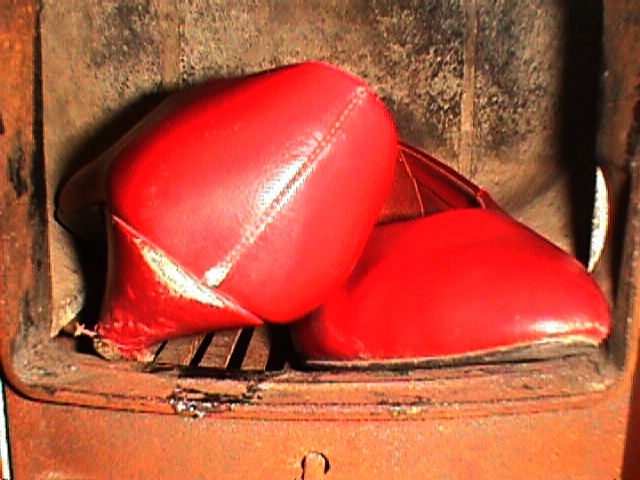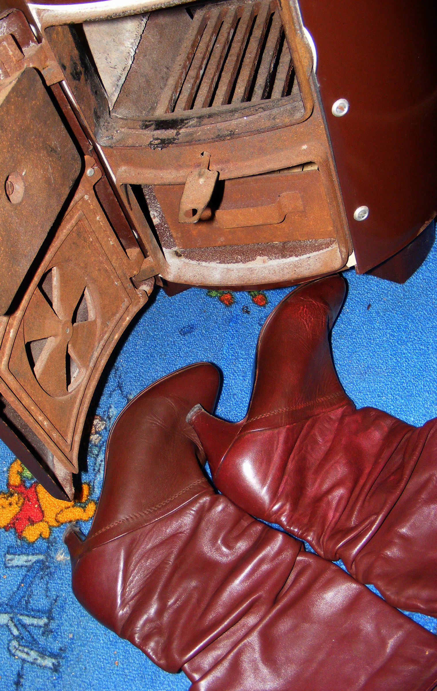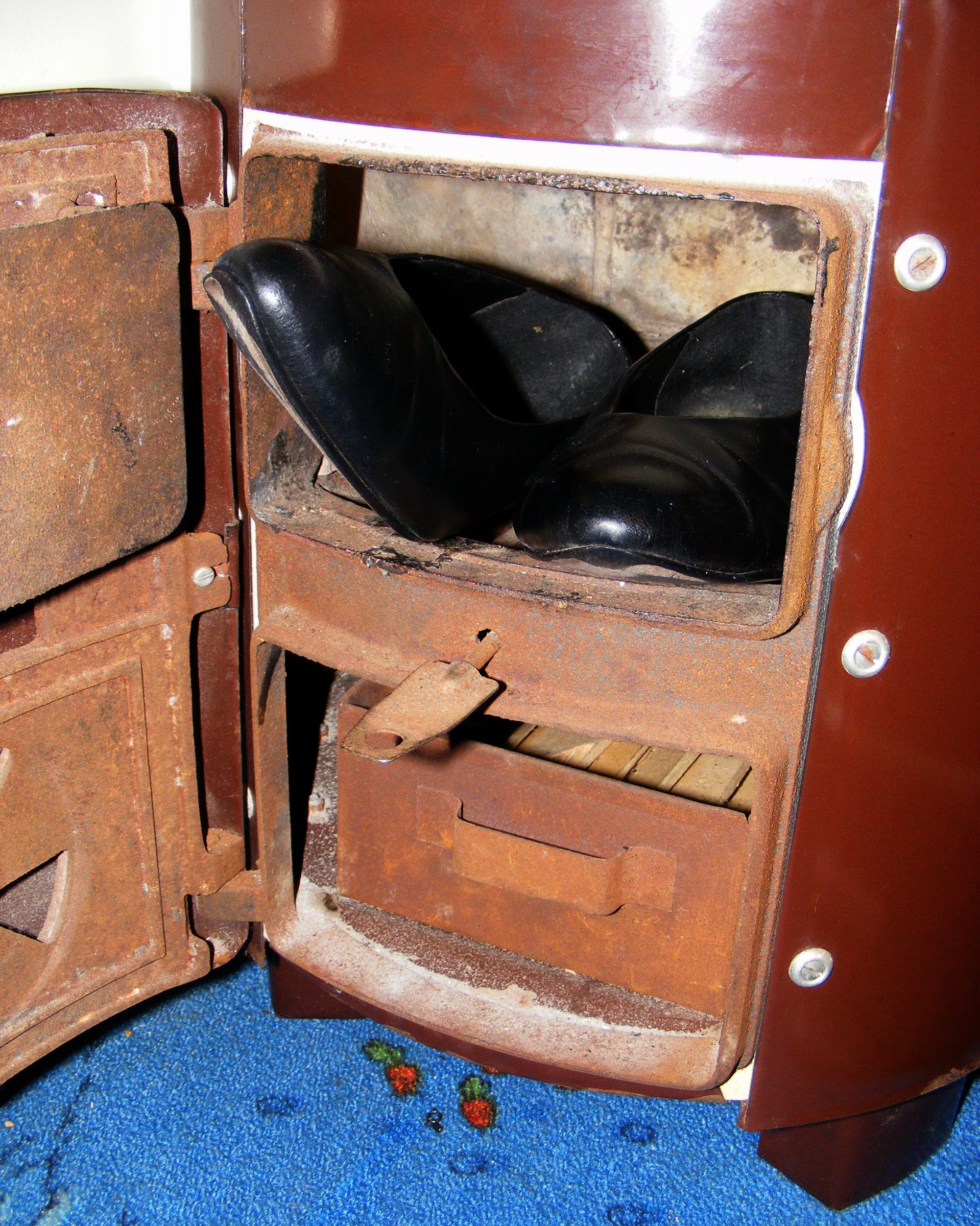 Die beim "Ausmisten" getragenen alten braunen Lederstiefel könnten eigentlich auch "mit weg", werden gegen die noch zur "Arbeit" am Ofen tauglichen blauen Pumps getauscht.