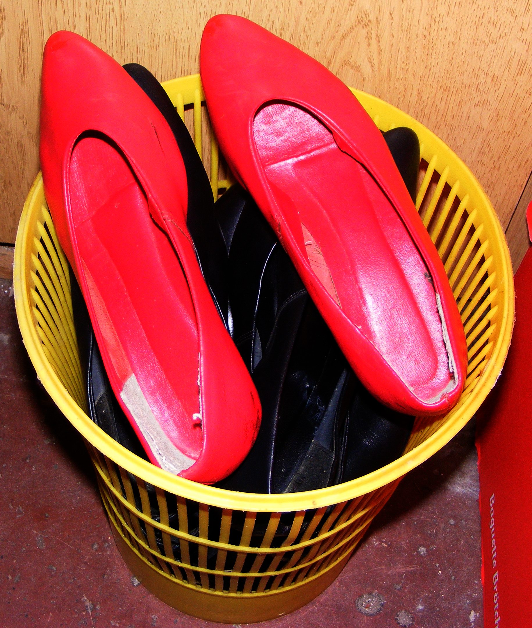 Zuerst wird der Korb nahe dem Schuhregal in "Wurfweite" in Stellung gebracht. Nach und nach werden alle "Arbeitspumps" geprüft - egal ob defekt oder einfach nur "zuviel" - was weg soll wirft die Kellnerin in den Papierkorb.