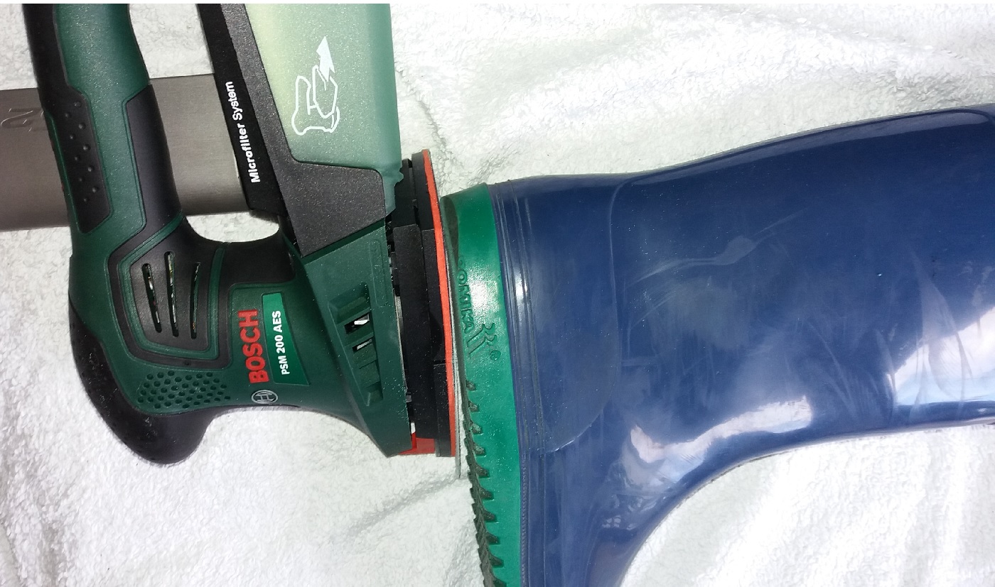 Ich bin der Idee gefolgt und habe einen Bobby mit Schleifpapier abgeschliffen. Echt klasse, der Stiefel wurde mit Schrammen versehen und der Glanz des gelben PVC ist fort.