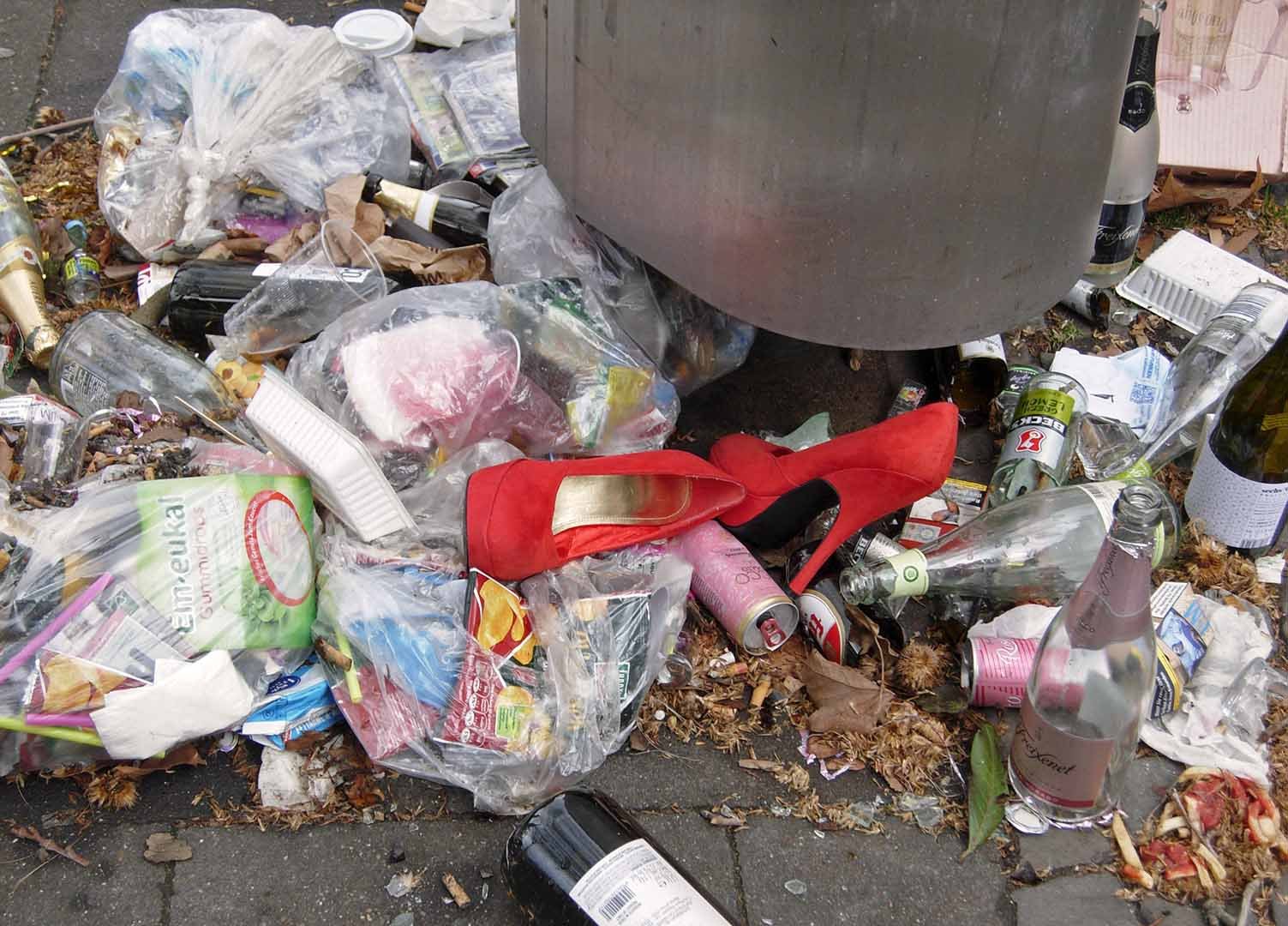 Rote Highheels im Karnevalsmüll.
