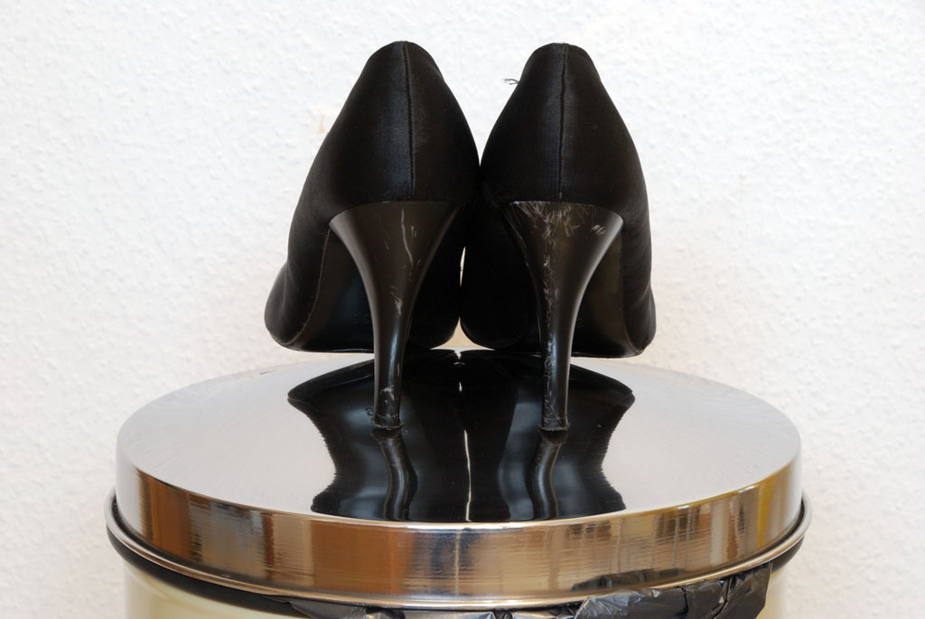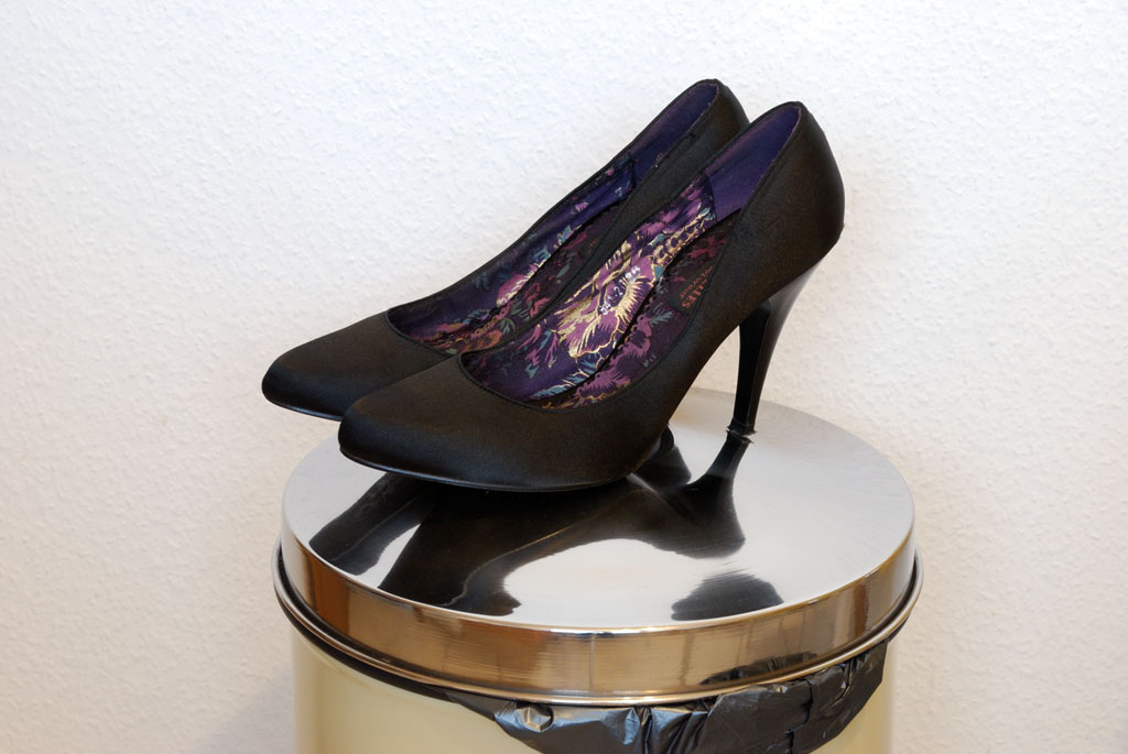 Die letzten Fotos meiner bei der Silvesterfeier ruinierten Satinpumps. Um das Feuerwerk besser sehen zu können hatte ich mich kurzerhand in einen der großen Blumenkübel vor unserem Hotel gestellt. Dummerweise war über der Blumenerde noch eine Lage Zierkieselsteine, was den darin versunkenen Absätzen ganz und gar nicht bekommen war. In wenigen Minuten der Unachtsamkeit wurden die schönen Schuhe leider zu Müll. Eigentlich wollte ich sie noch bis Fasching aufheben, und ihnen noch den Rest geben, so aber sind die Schuhe gestern, spontan in unserem gut vorgeheizten Kachelofen gelandet. Noch bevor ich den zweiten Schuh hinein schieben konnte, stand der erste komplett in Flammen, und nach zehn Minuten war nichts mehr vorhanden. Zurückgeblieben ist von jedem Schuh nur ein rostiges, verbogenes Blech, welches natürlich als Wertstoff im gelben Sack gelandet ist.